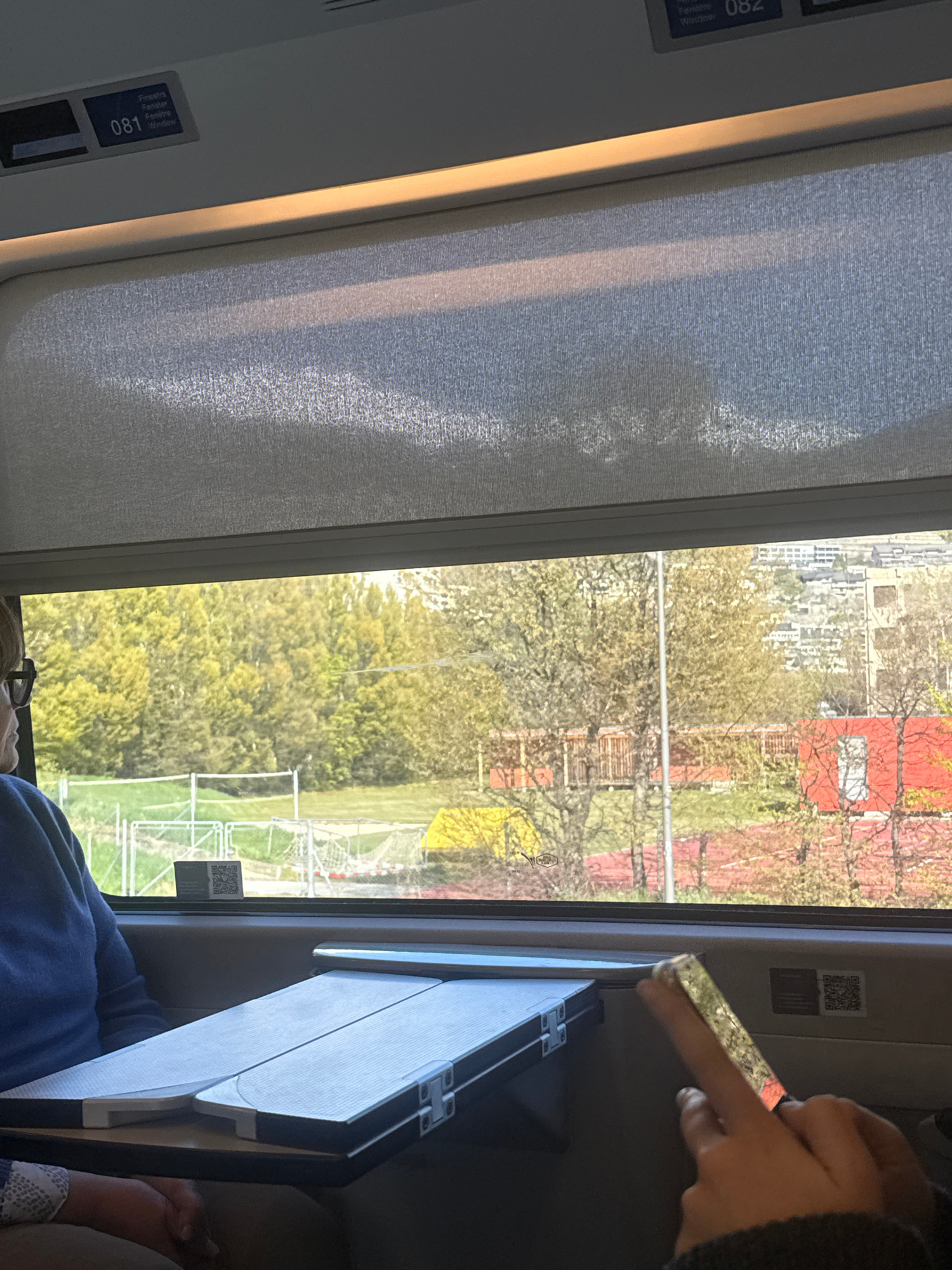 A view from inside a train carriage traveling through Sion, Switzerland. A window shows an exterior view of a city with a mix of residential buildings and green areas. Trees with green and yellow foli…read more