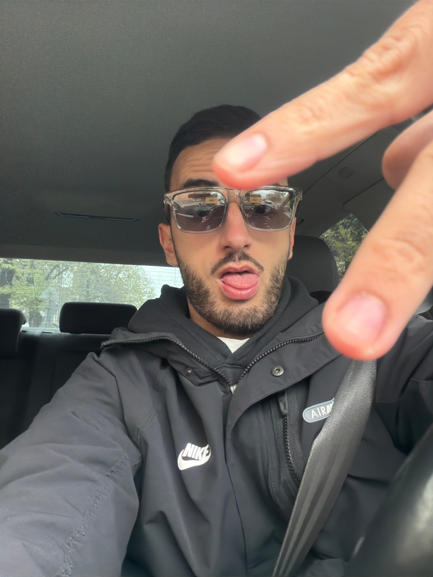 A man wearing a black Nike jacket and clear-rimmed sunglasses is sitting in a car, wearing a seatbelt. He is sticking his tongue out and making a peace sign with his fingers. The location is indetermi…read more