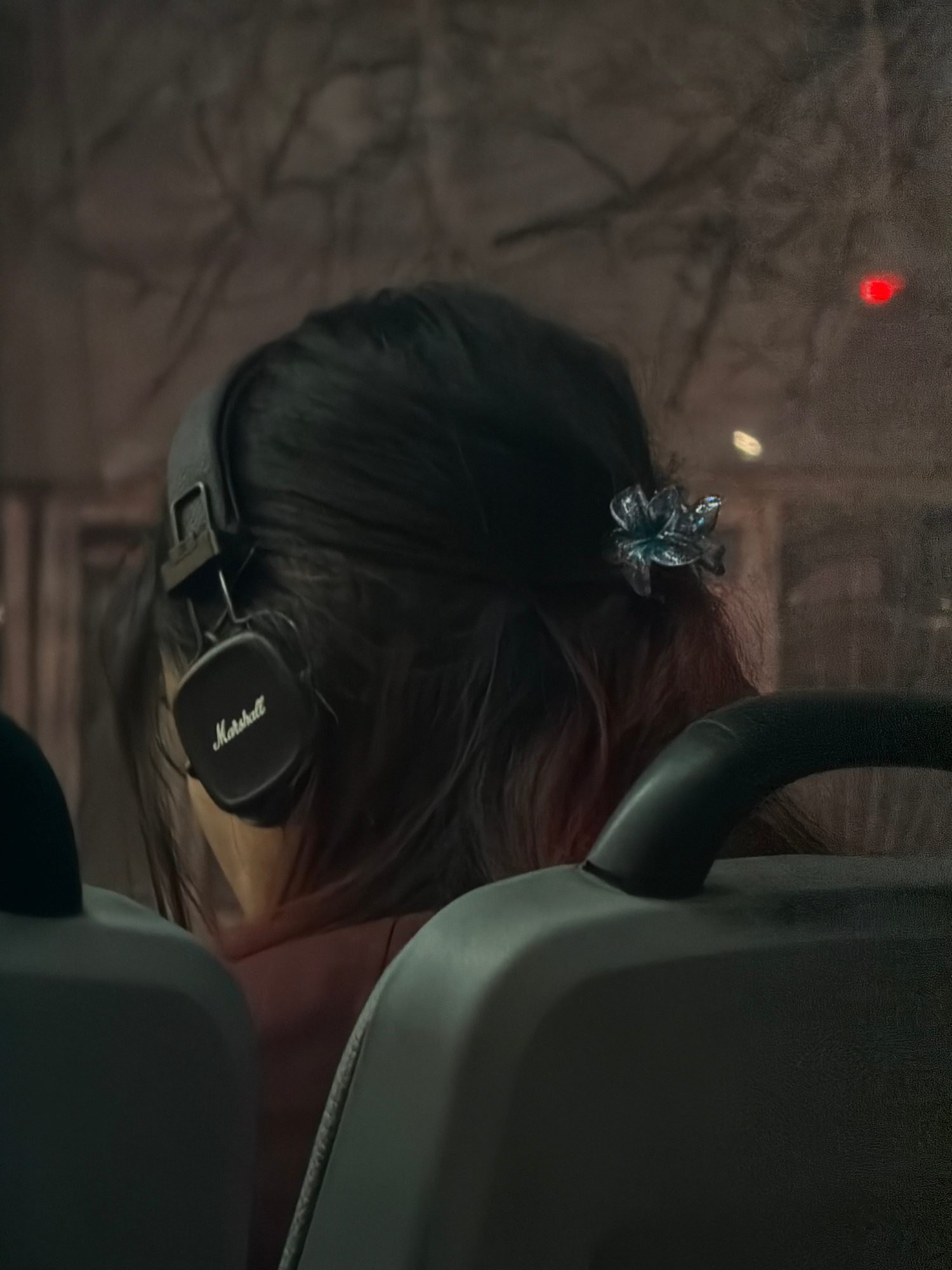 A person with dark hair and a flower-shaped hair clip is wearing Marshall headphones in what appears to be a vehicle. Reflected in the window are blurred images suggesting an urban environment at nigh…read more