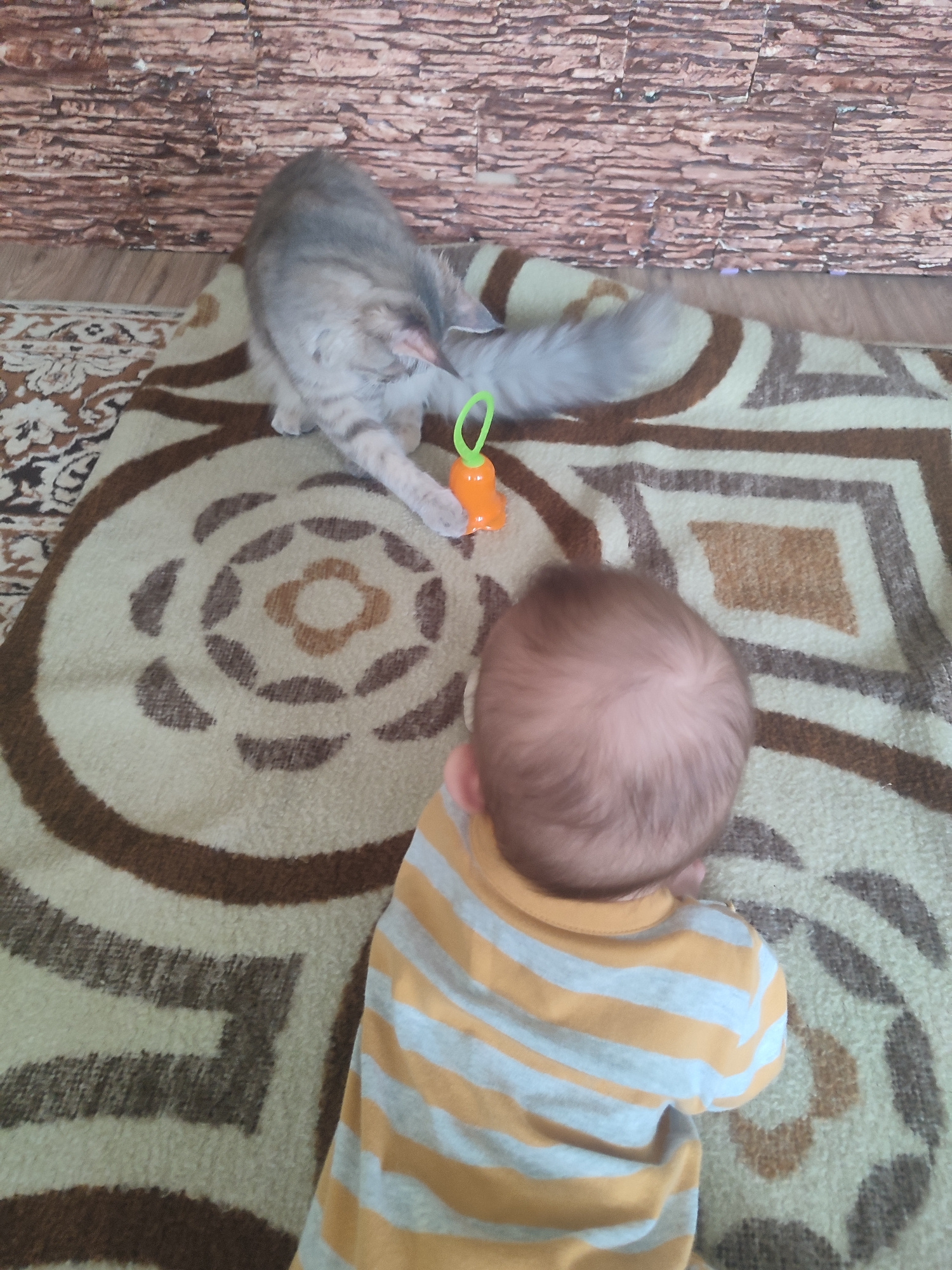 A gray cat is playing with an orange toy on a rug with a circular pattern. A baby in a yellow and white striped shirt is lying on the rug, looking towards the cat. The background includes a wall with…read more