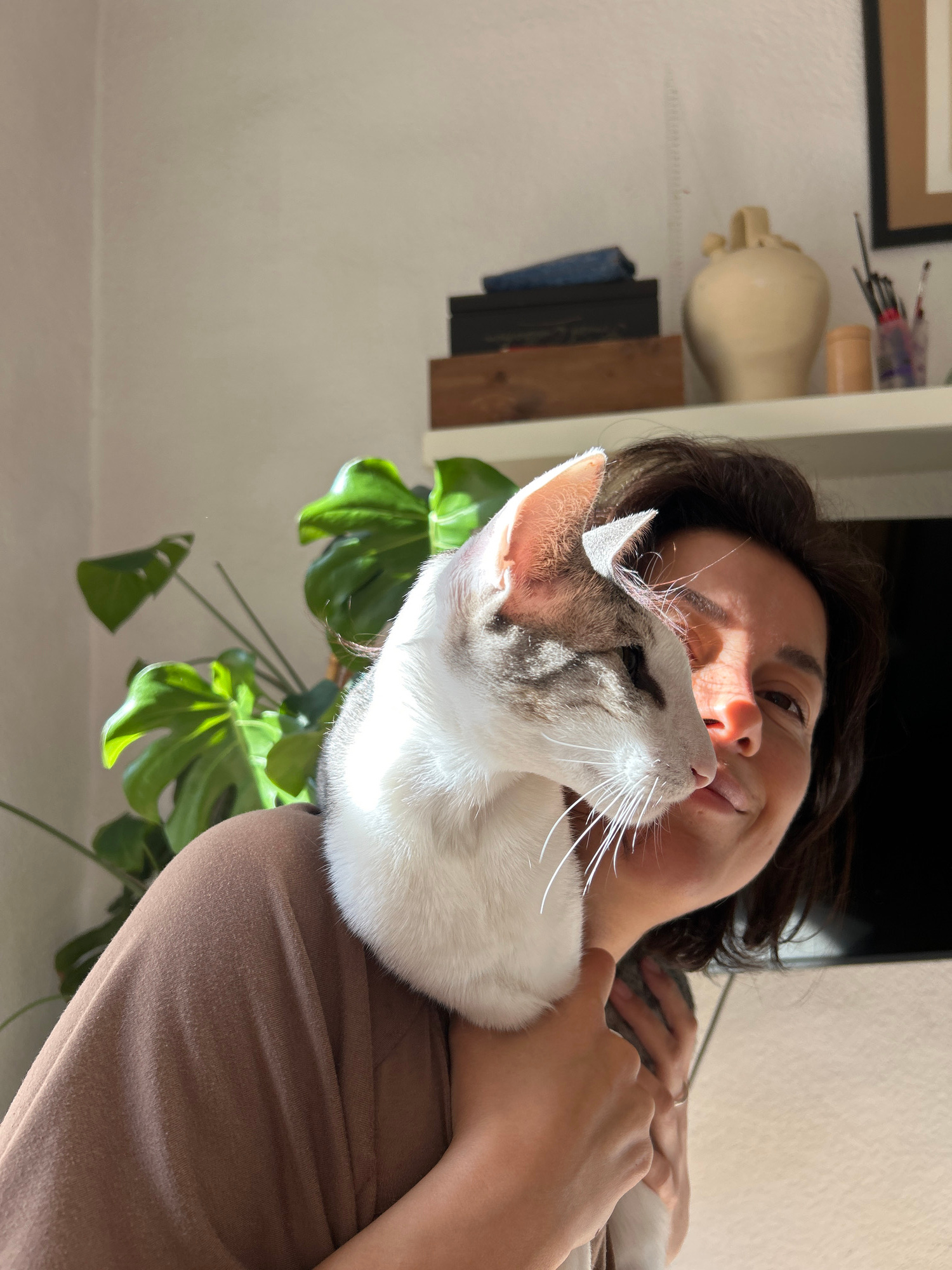 The image, taken in Barcelona, Spain, captures a tender moment between a woman and her cat from a low-angle perspective. The photo is rotated clockwise, giving an unusual orientation. The primary sub…read more