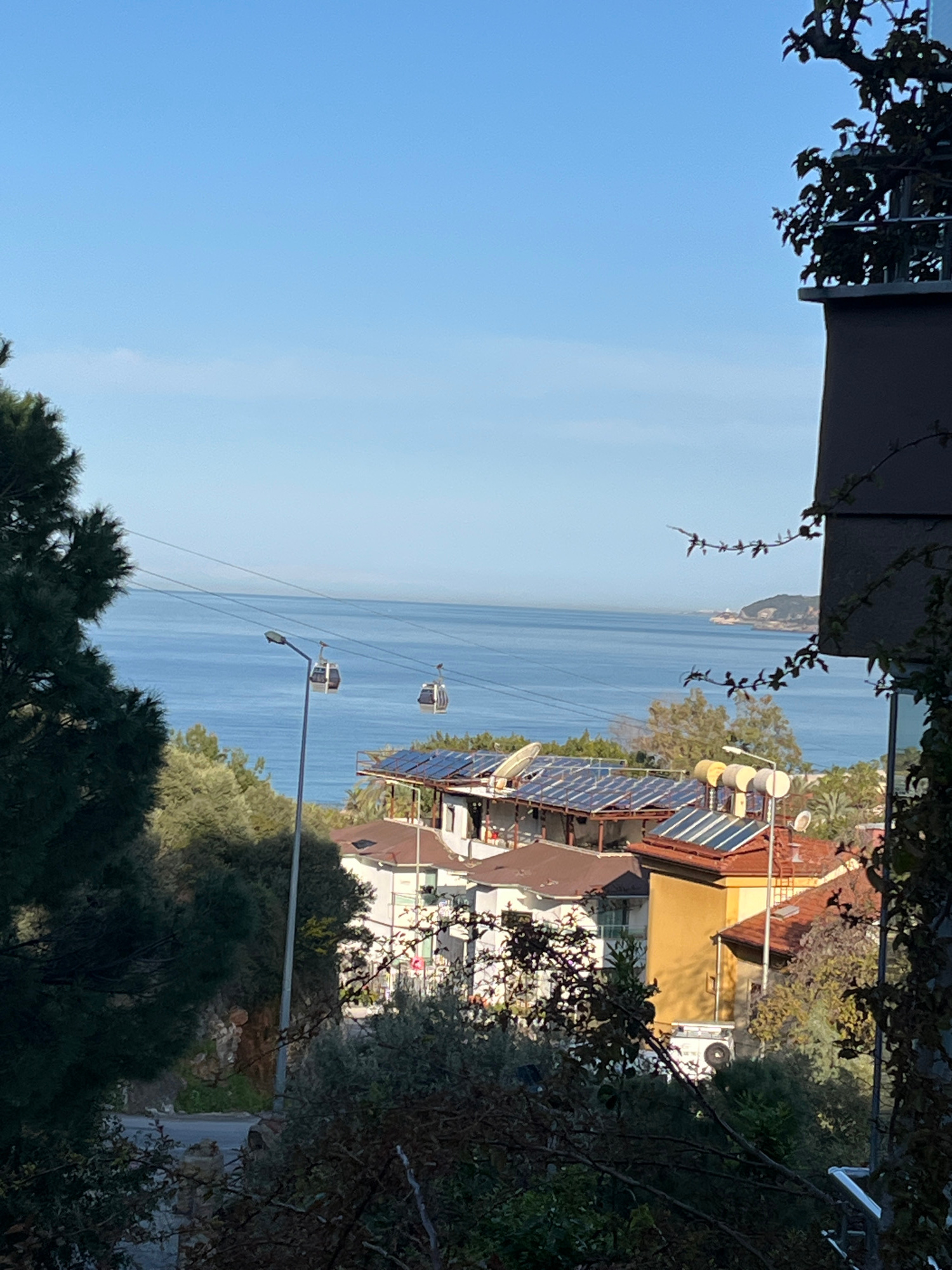 The image displays an elevated view of Alanya, Turkey, under a clear blue sky. The upper two-thirds of the frame consists of the sky and the calm, blue Mediterranean Sea, meeting at a distinct horizon…read more