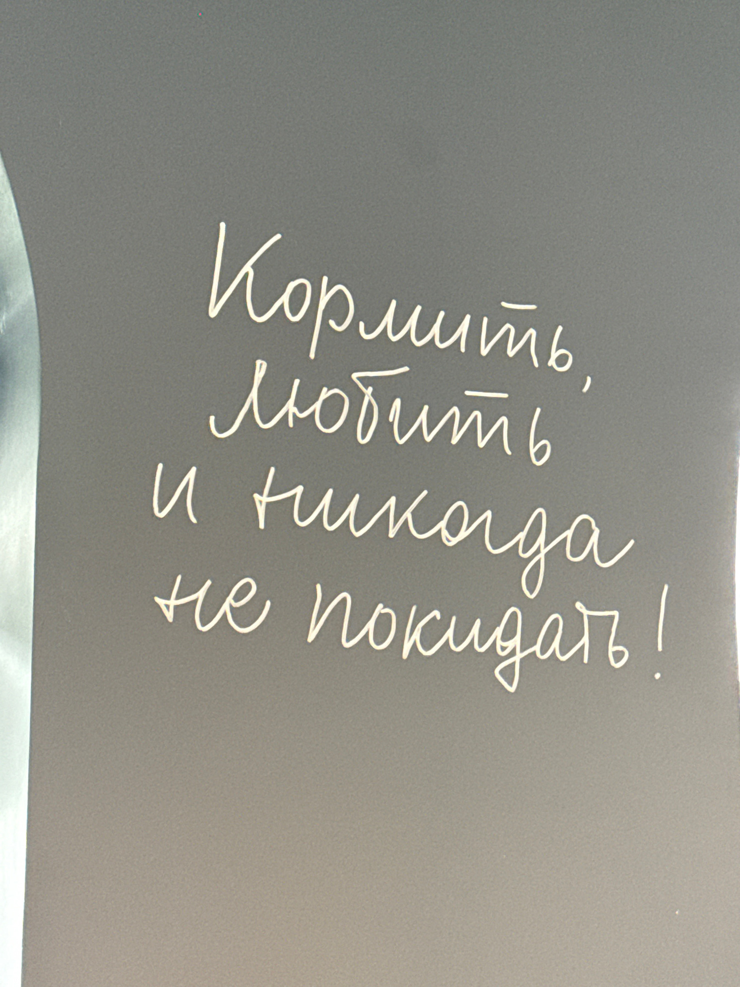 The image shows a dark grey wall or surface adorned with white, handwritten-style text. The text is oriented diagonally, running from the top left to the bottom right of the frame. The background has…read more