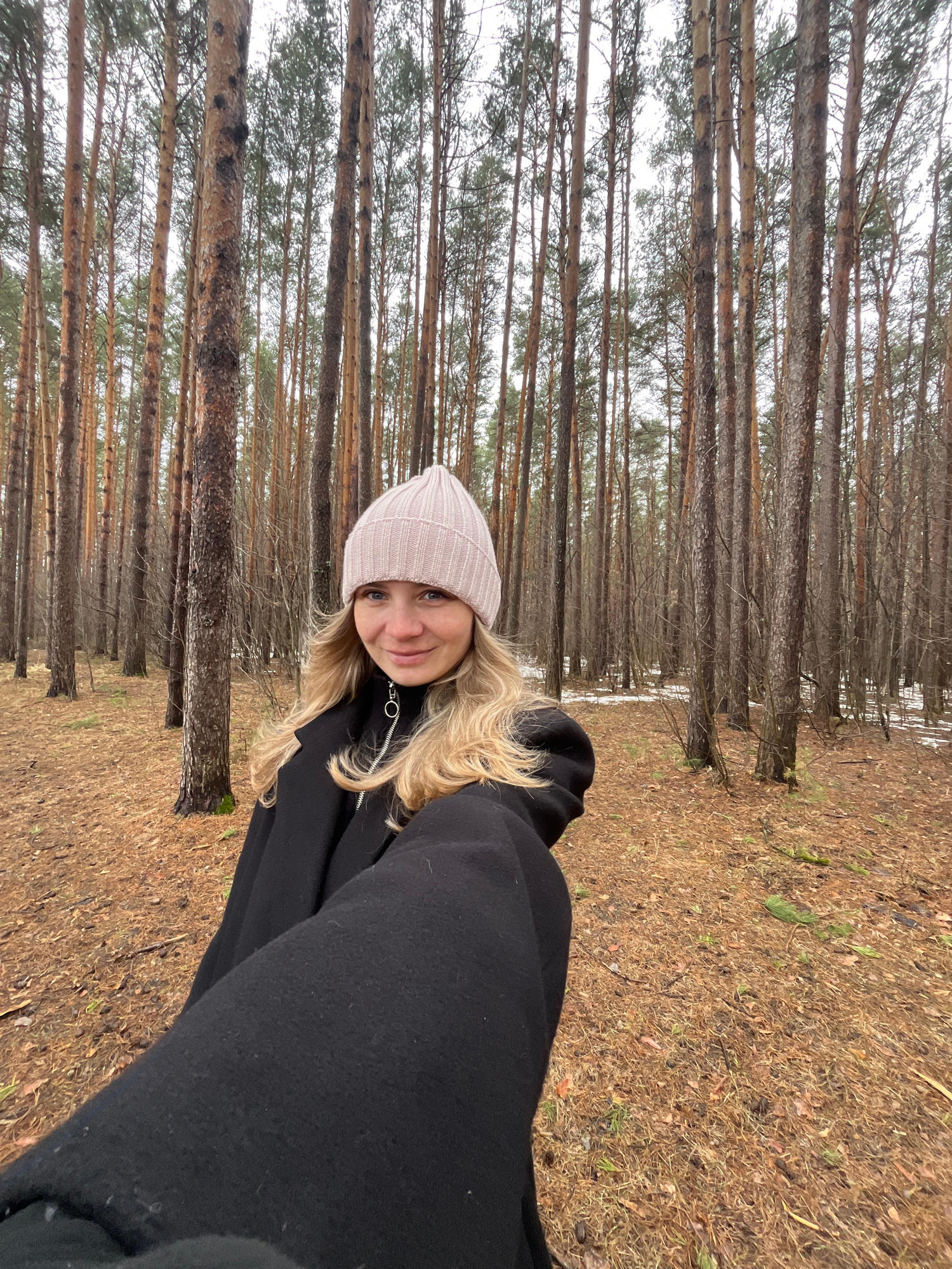 A young, blonde woman is taking a selfie in a pine forest. She is wearing a light pink beanie and a black hooded jacket. The forest consists of tall, thin pine trees with bare branches. The ground is…read more