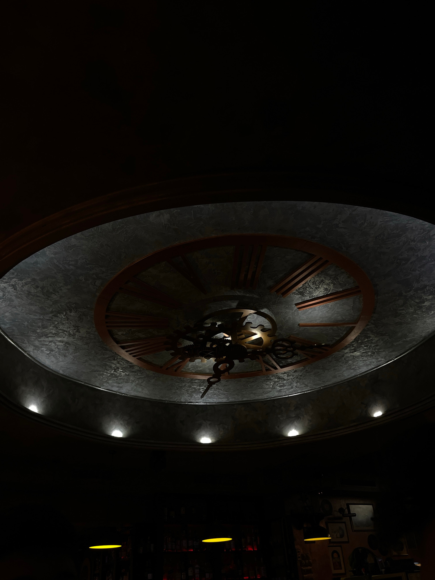 The image depicts a large, ornate clock on a dark wall. The clock has a textured grey face with Roman numerals and a complex central mechanism. The clock is lit by several small, round lights position…read more