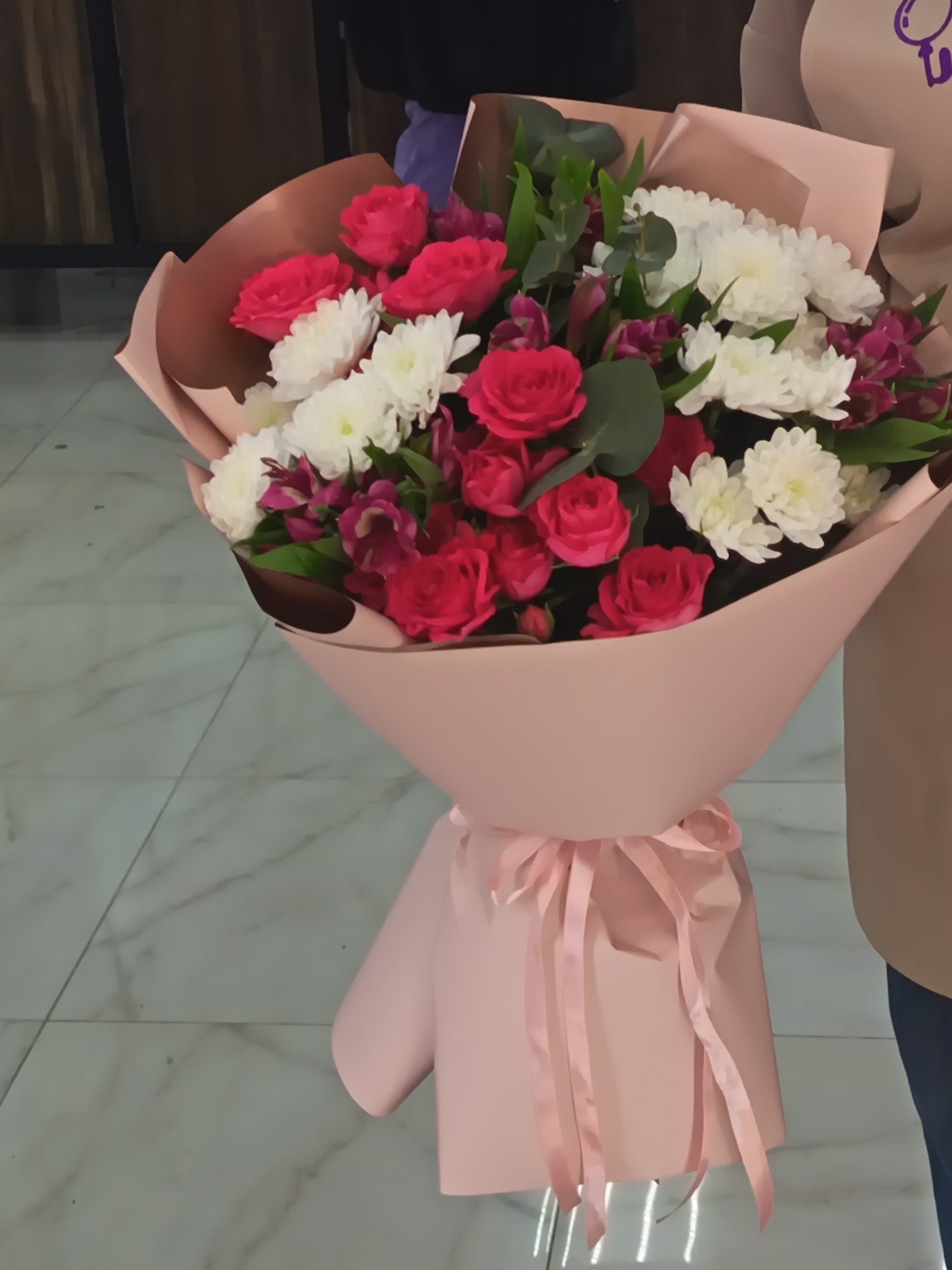A large, colorful bouquet of flowers is prominently displayed, held by a person partially visible on the right side of the image. The bouquet features a rich assortment of red roses, fluffy white chry…read more