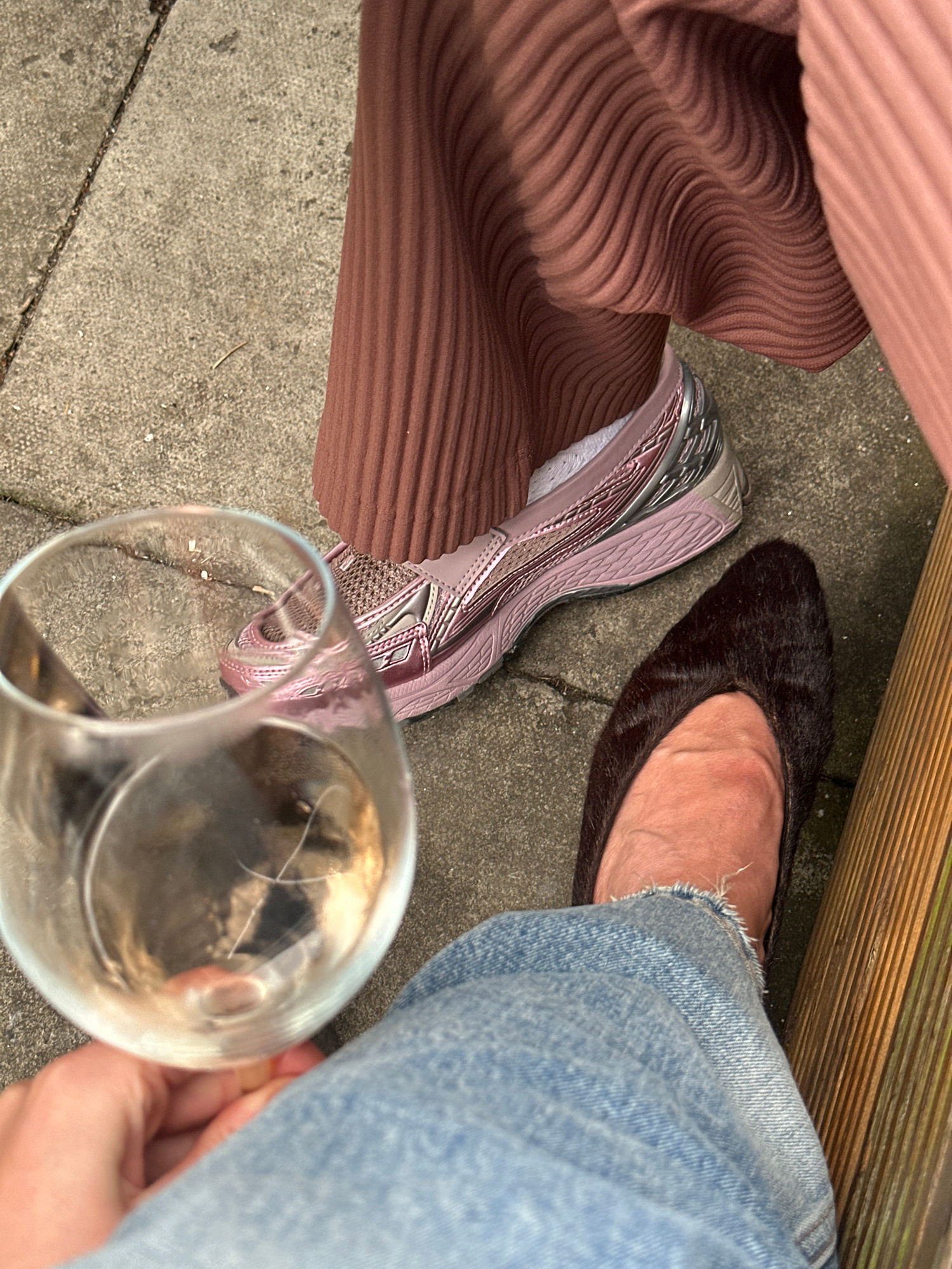 The image shows an overhead view of three people's feet and legs. One person is wearing a brown, pleated dress and pink sneakers. Another person is wearing blue jeans and brown, furry flats. A third p…read more
