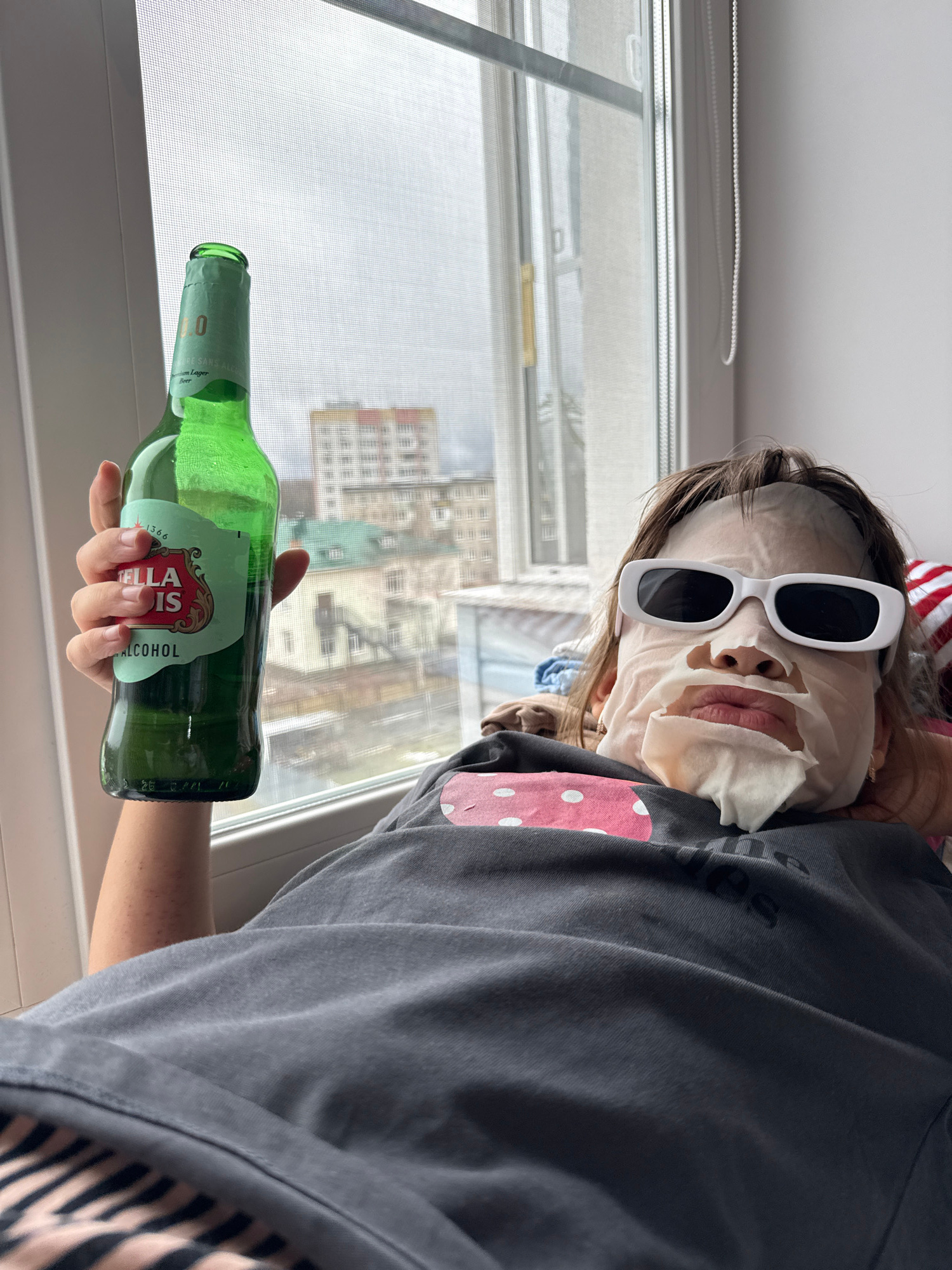 A person wearing a white face mask and white sunglasses holds a green glass bottle of Stella Artois beer. The person is wearing a gray t-shirt with a red and white polka dot design. The background fea…read more