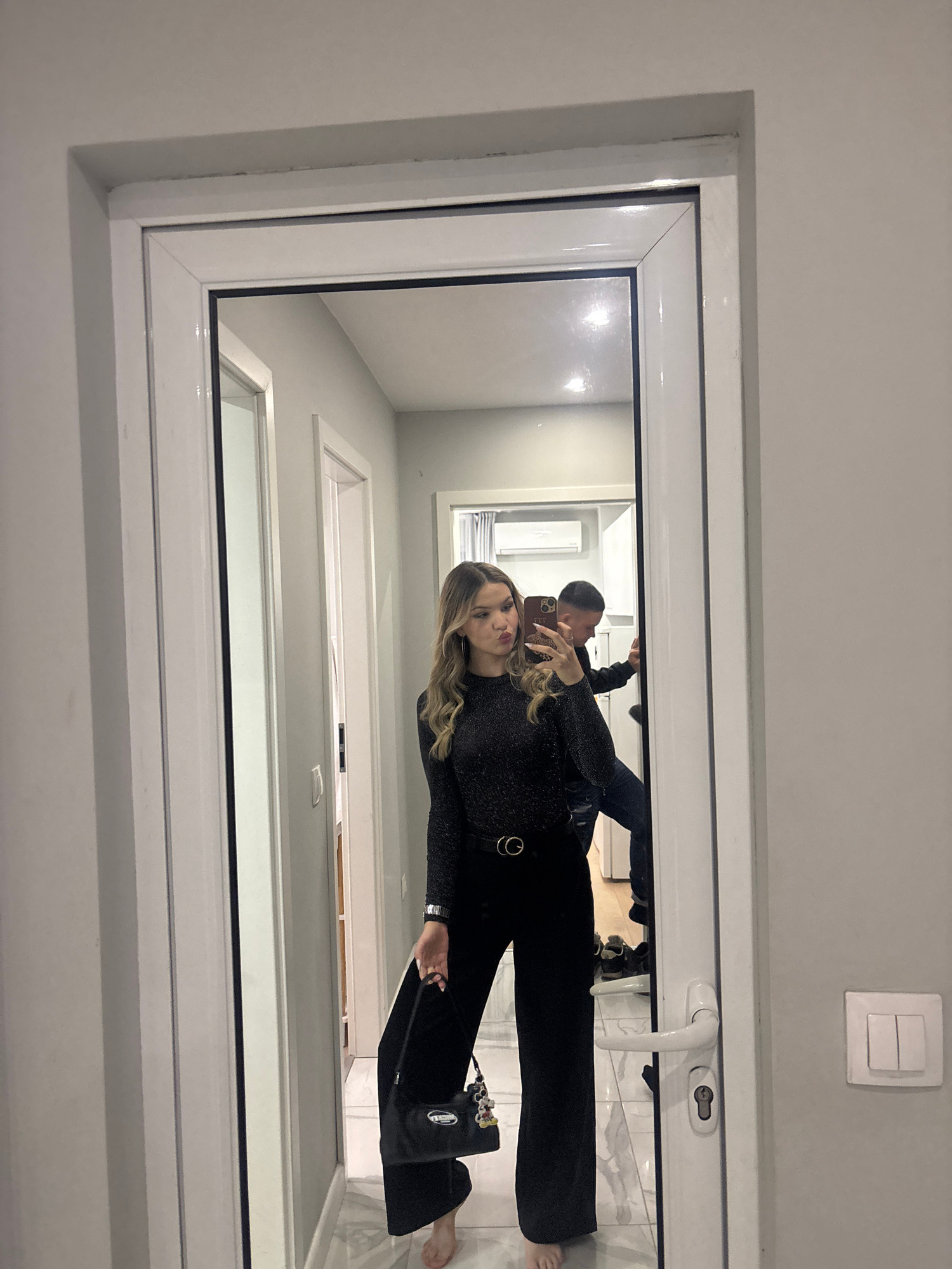 A woman is taking a selfie in a mirror. The mirror is framed by a white door frame. The woman has long blonde hair and is wearing a black outfit with a sparkly top. She is holding a black purse. Anoth…read more