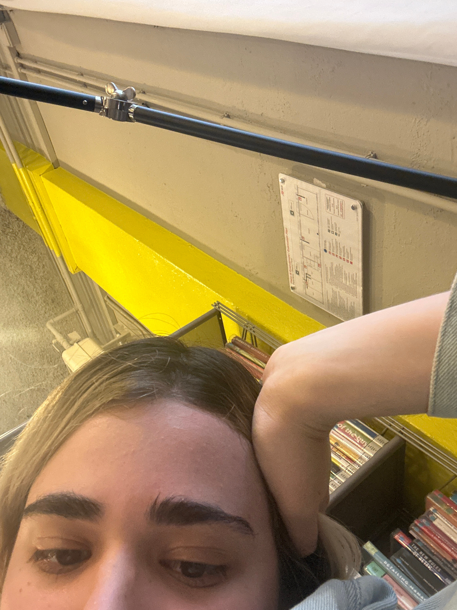 A selfie, taken from an eye-level perspective, features a person in the lower right corner of the frame, partially obscuring a view of shelves filled with books. An arm clad in a denim jacket also int…read more