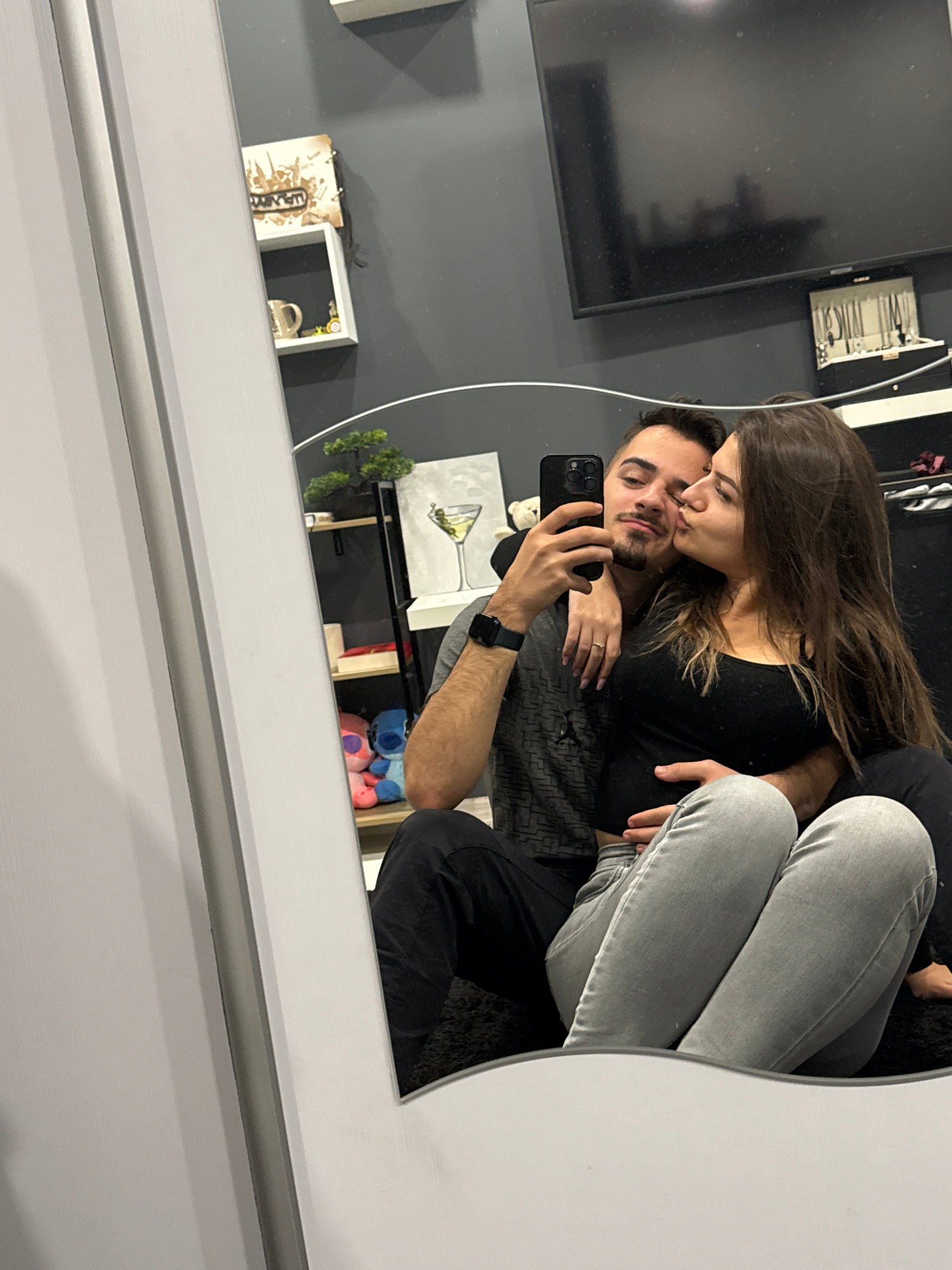 A mirrored selfie shows a couple. A woman with long brown hair wearing a black shirt kisses a man with a beard and dark hair on the cheek. The man is holding a black smartphone and wearing a watch onβ¦read more