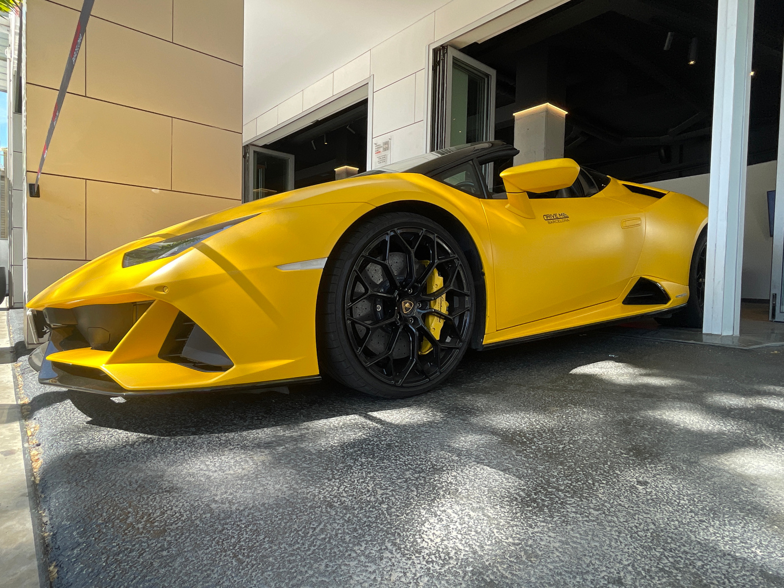 A vibrant yellow Lamborghini Huracán Spyder, appearing to have a matte or satin finish, is prominently displayed, partially indoors and partially outdoors, in Barcelona, Spain. The sleek, convertible…read more