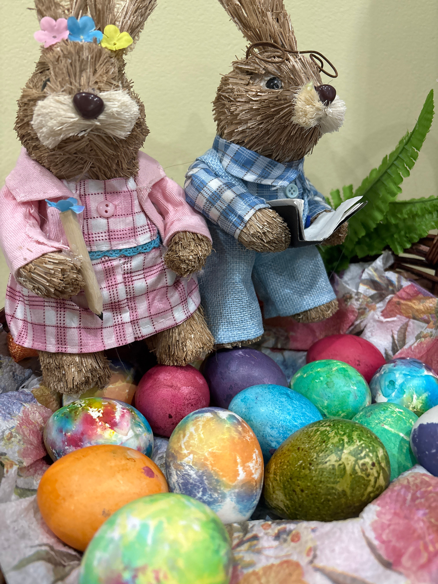 The image depicts a wreath with two straw bunny figures and numerous colorful Easter eggs. One bunny is wearing a blue plaid shirt and eyeglasses, holding a notebook, while the other is wearing a pink…read more