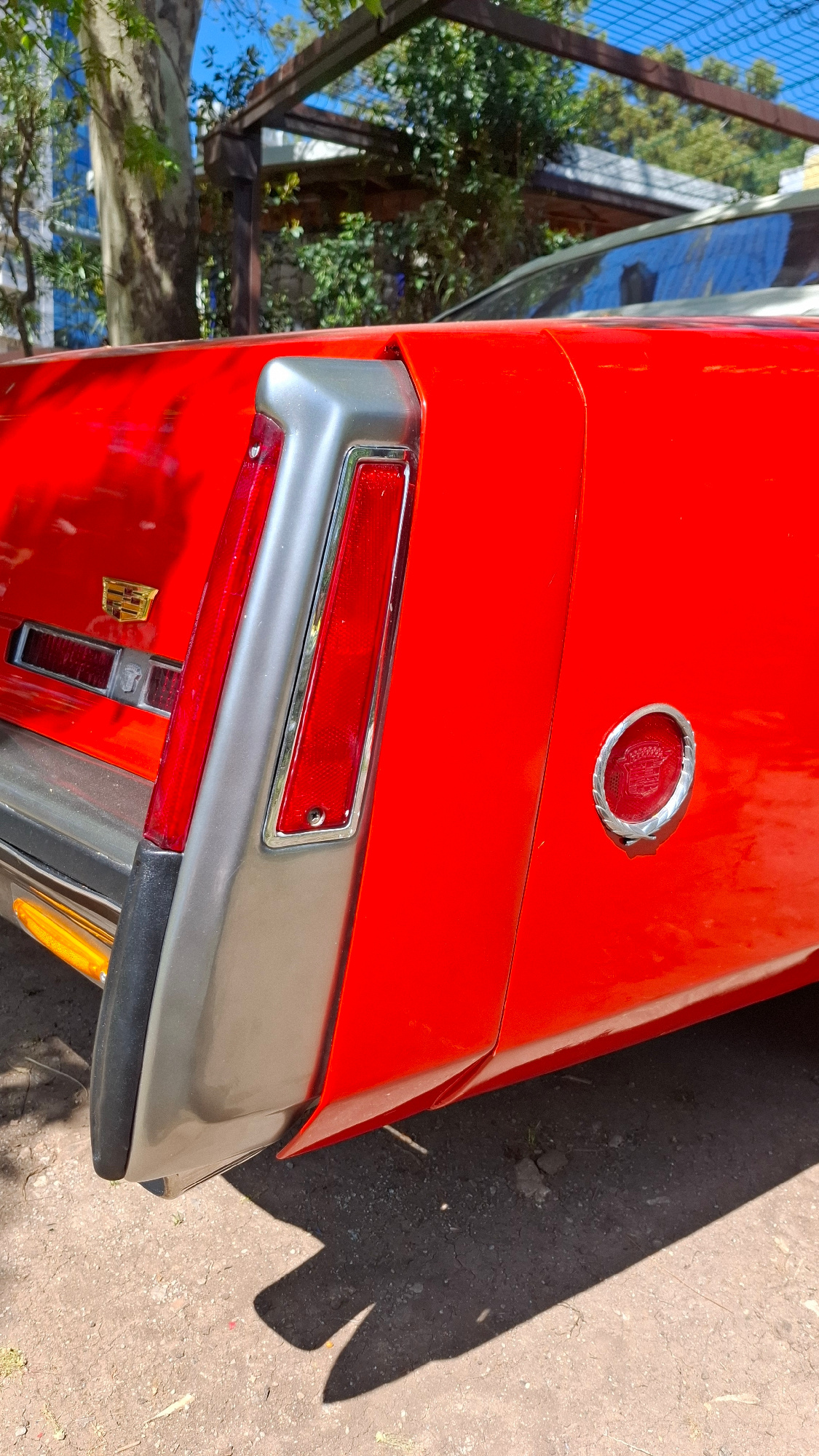 A close-up shows the rear of a red vintage Cadillac automobile, parked outdoors on pavement. The image captures details like the Cadillac emblem, tail lights, and chrome accents. The background shows…read more