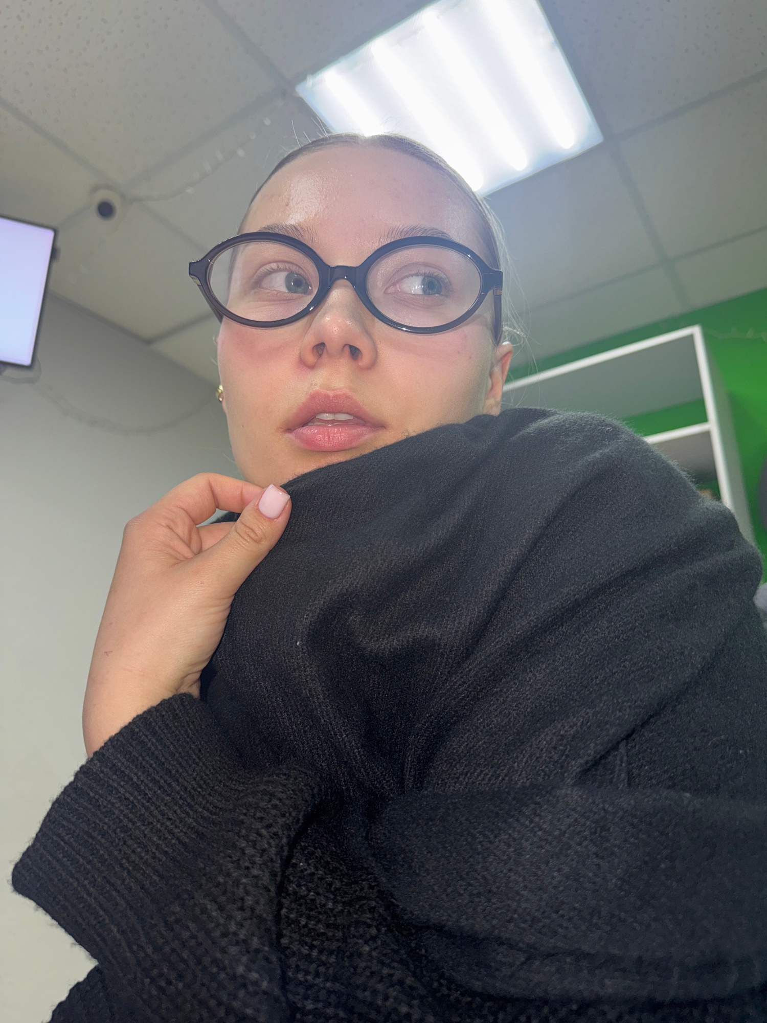 A woman with fair skin and blonde hair pulled back is pictured indoors, wearing black-rimmed glasses and a dark, possibly knitted, top. She is holding her hand near her face, with painted, pale pink nā¦read more