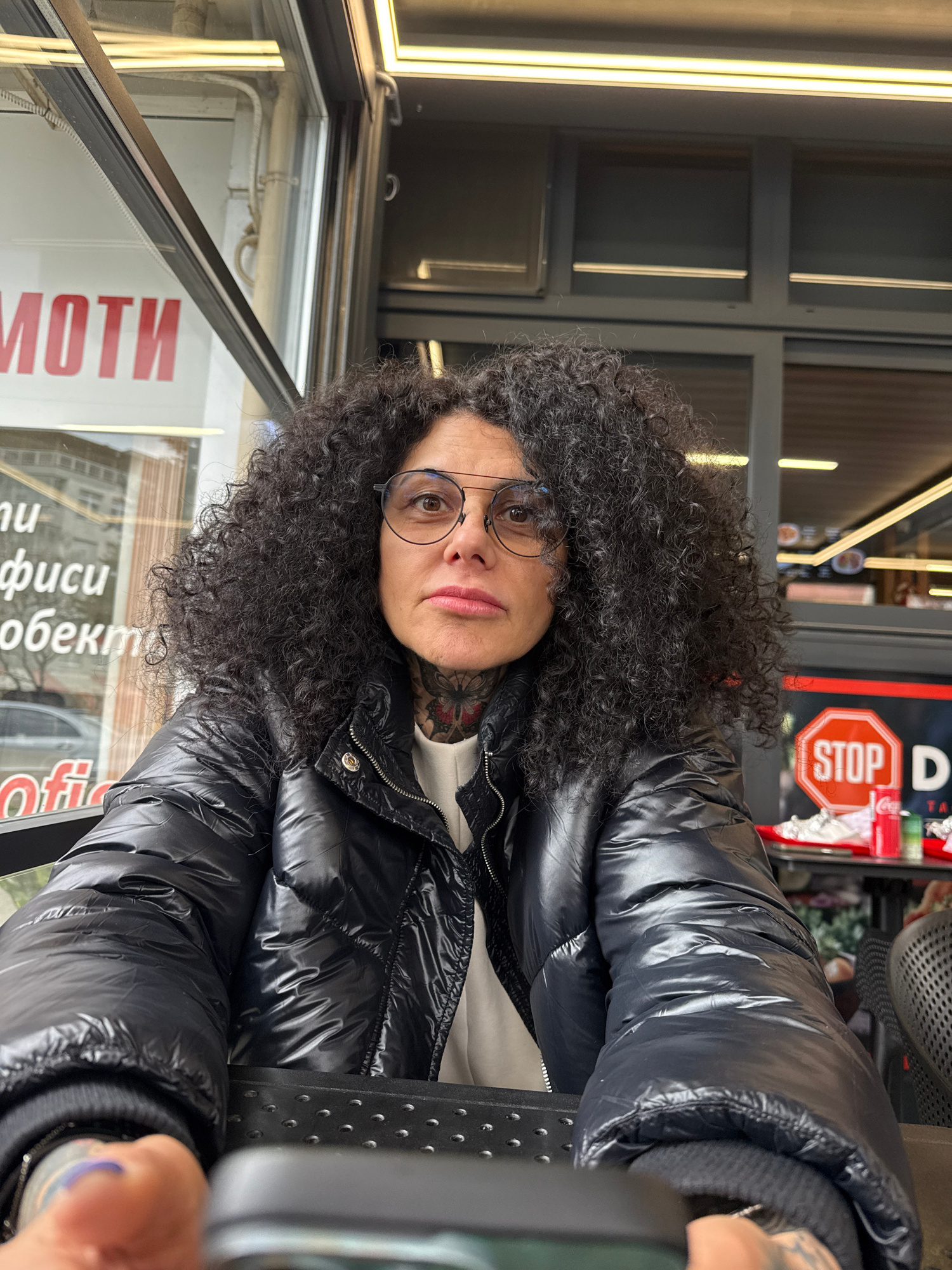 A woman with dark curly hair and glasses is posing for a selfie. She is wearing a shiny black puffer jacket. She has tattoos visible on her neck and arm. The photo appears to be taken inside a buildin…read more