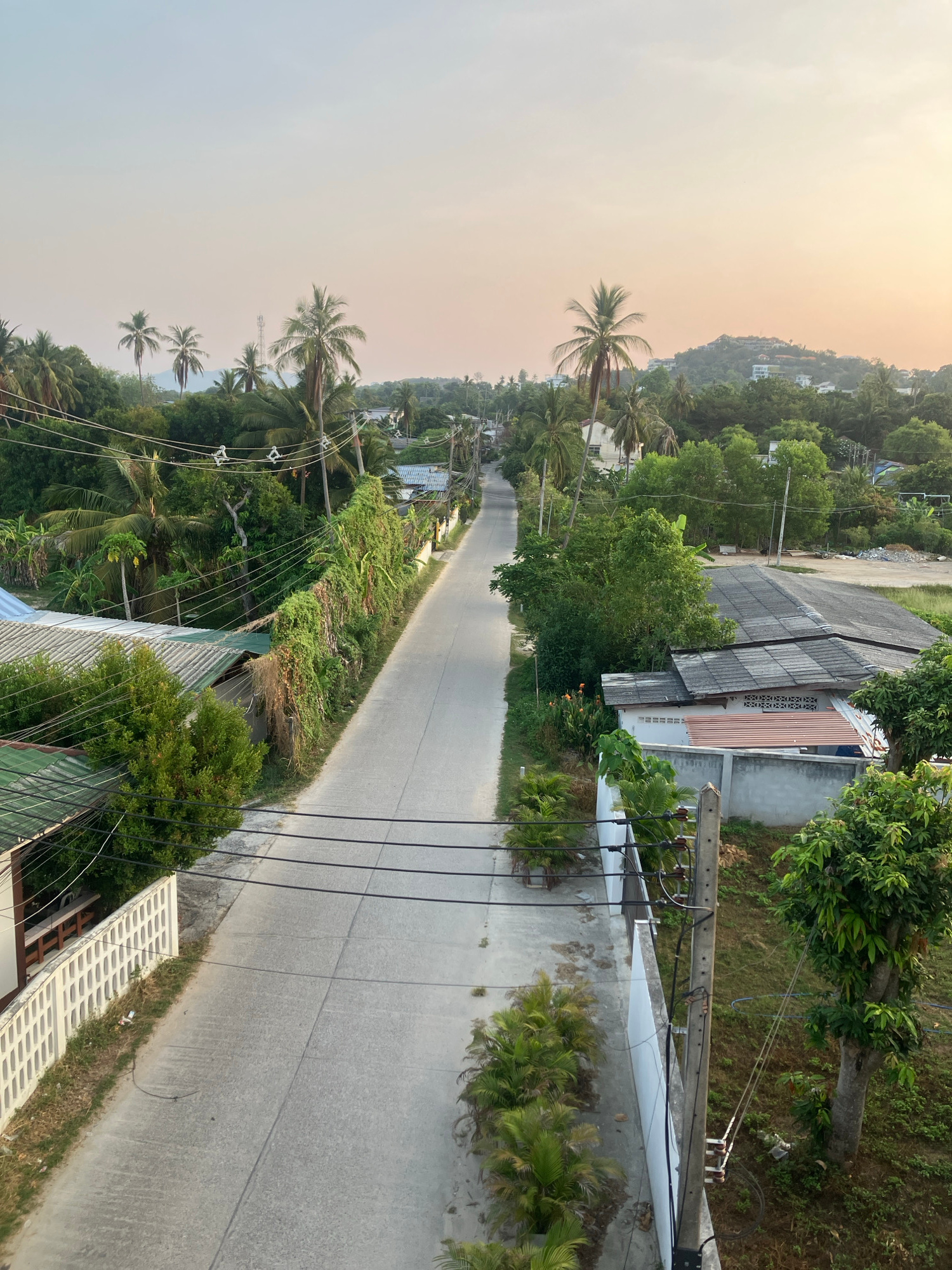 An aerial view depicts a straight road running through Baan Plai Laem, Thailand. The road is flanked by tropical vegetation, including palm trees. Buildings and houses with corrugated roofs line eithe…read more