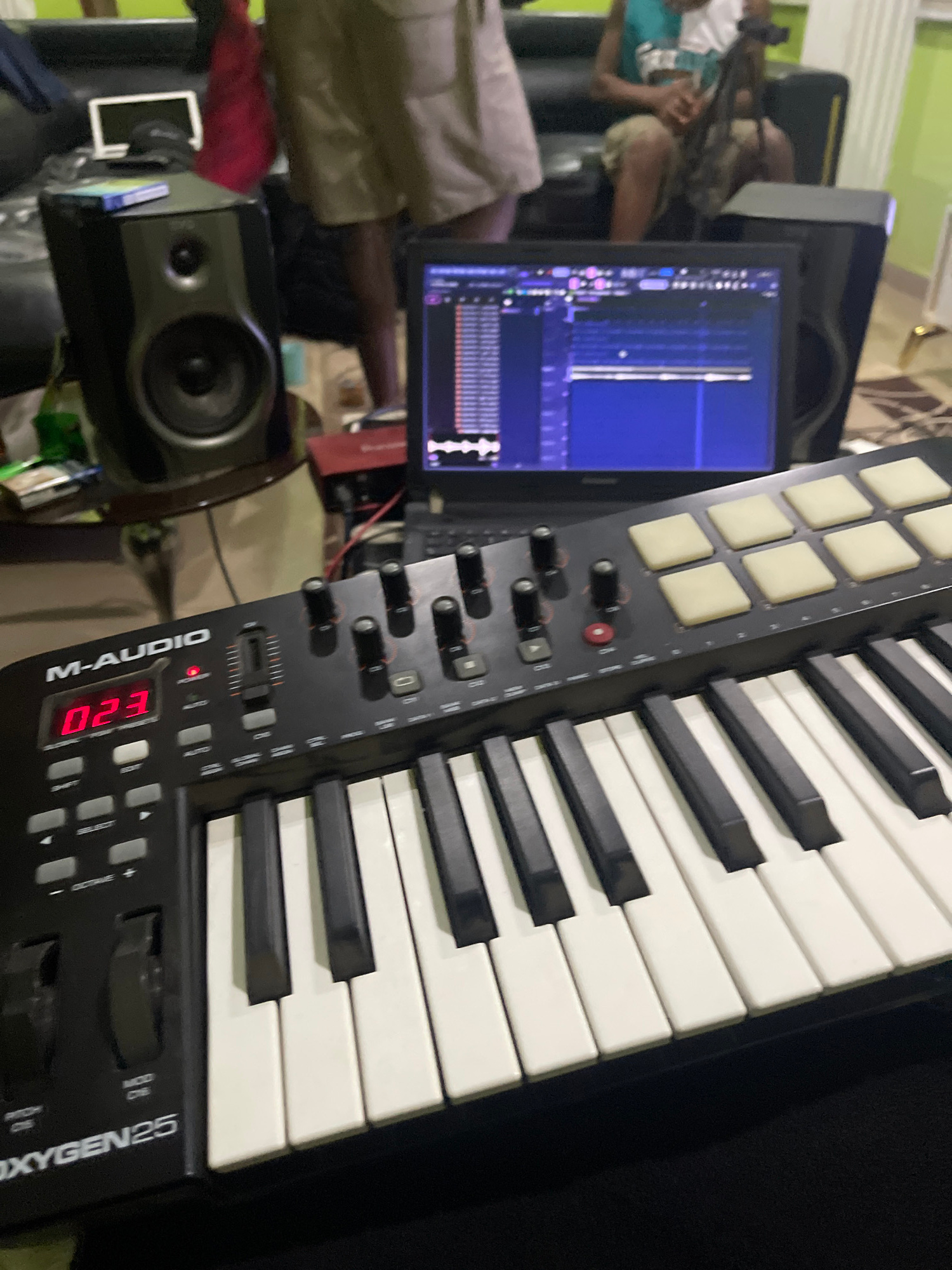 The image depicts a music production setup. In the foreground is an M-Audio Oxygen 25 MIDI keyboard, angled towards the right. Behind it is a laptop displaying music production software with waveforms…read more