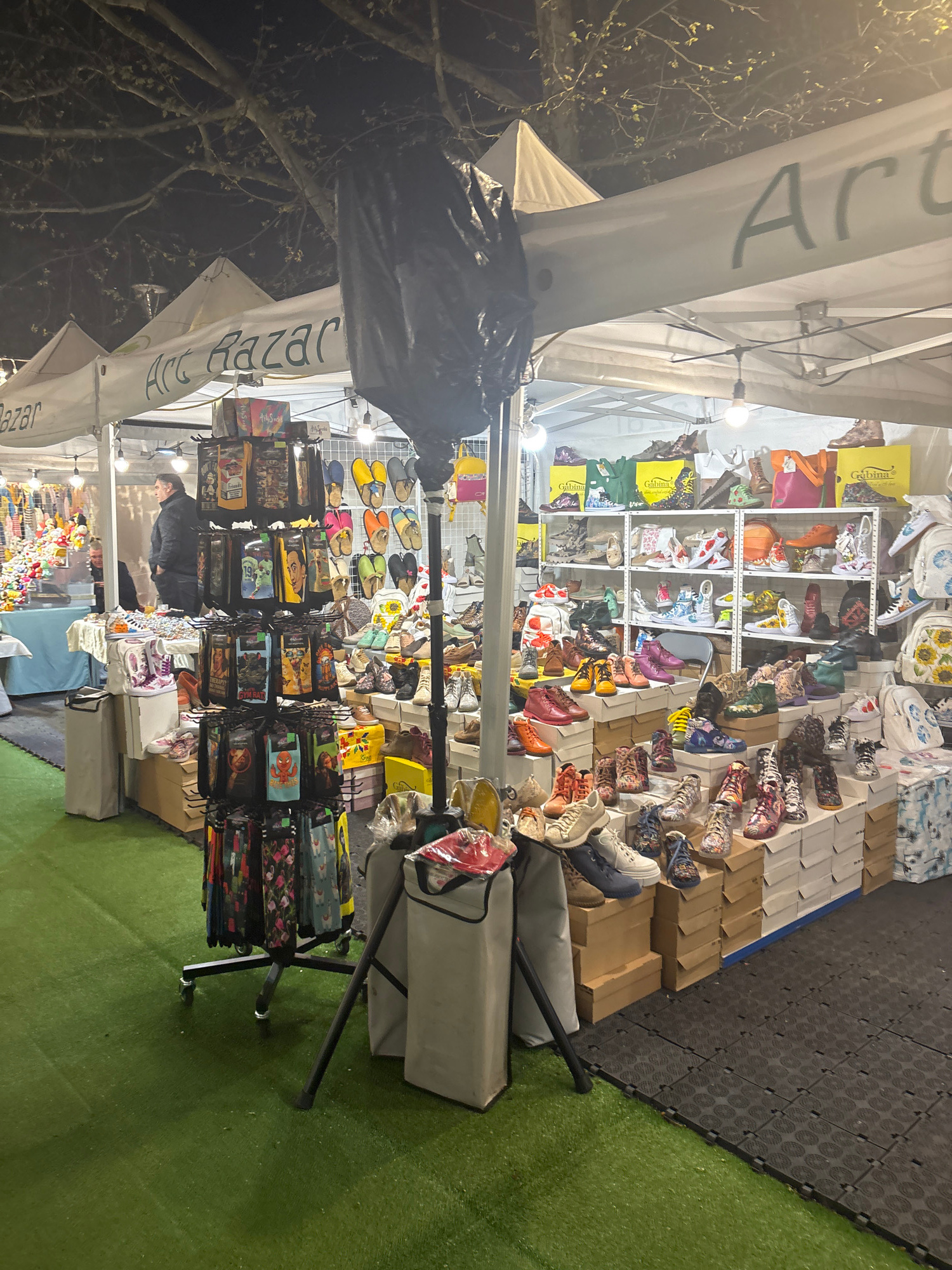 This image captures a vibrant outdoor market stall at night in Sofia, Bulgaria, characterized by artificial lighting. The scene is set under white tent canopies, one of which prominently displays the…read more