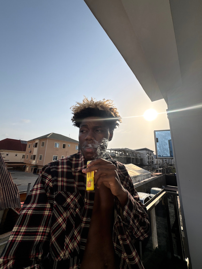 The image captures a male individual on a balcony in Igboefon, Nigeria. The subject, a dark-skinned male with short, curly hair featuring blonde highlights, is depicted from the chest up, wearing an uā¦read more