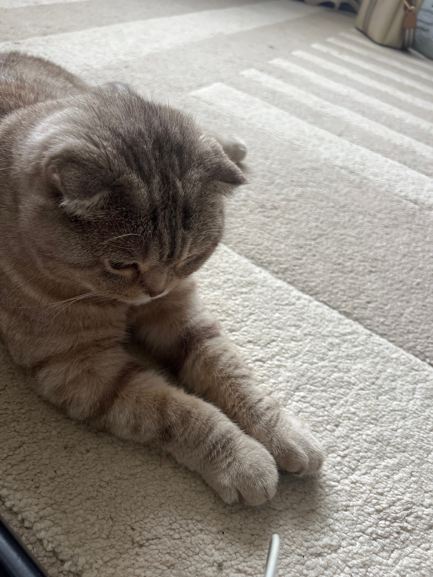 A domestic cat is captured in a close-up, high-angle shot, resting peacefully on a light-colored, textured carpet. The cat, possibly a Scottish Fold due to its distinctive folded ears, lies on its sid…read more