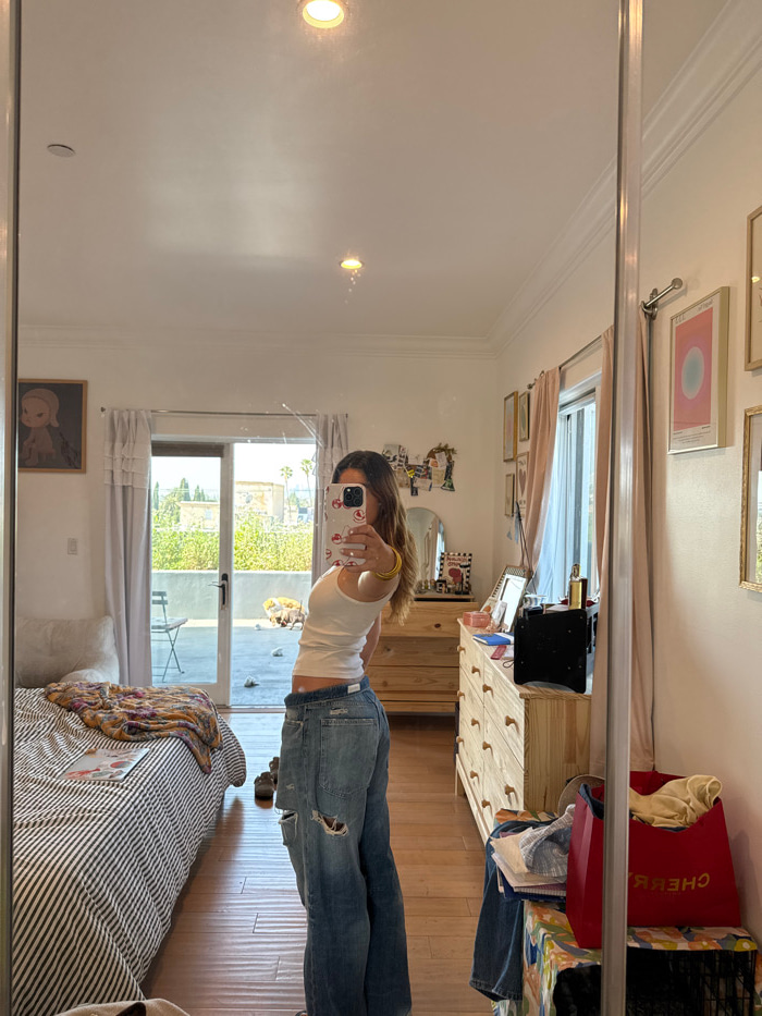 A mirror selfie shows a woman in a white top and ripped, wide-legged jeans. The room behind her features a wooden dresser cluttered with items, artwork on the walls, and a window revealing greenery. A…read more