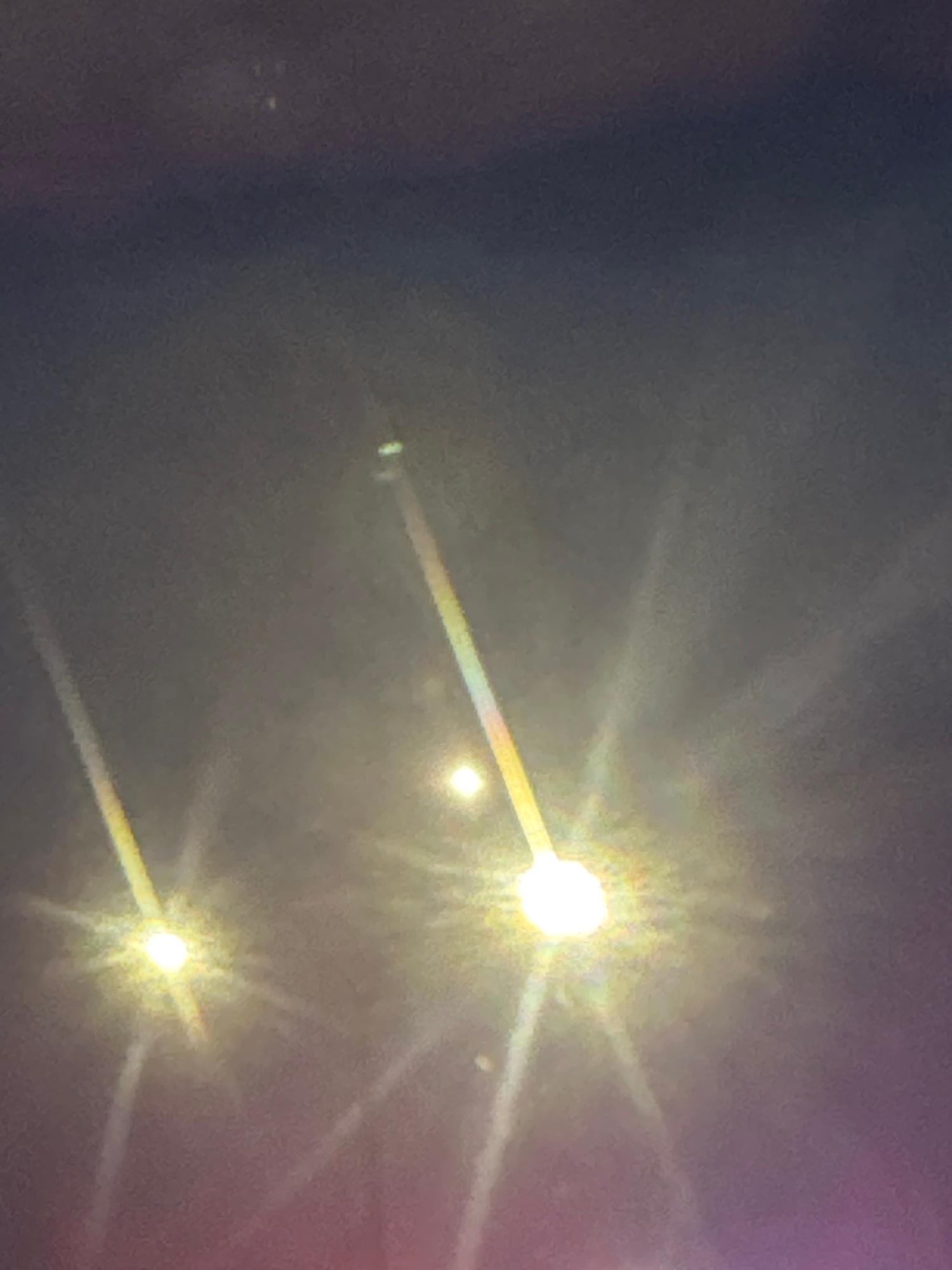 The image depicts an outdoor night scene in Tbilisi, Georgia. The sky appears overcast and dark, with the illumination primarily coming from streetlights. Two distinct streetlights are visible, emitti…read more