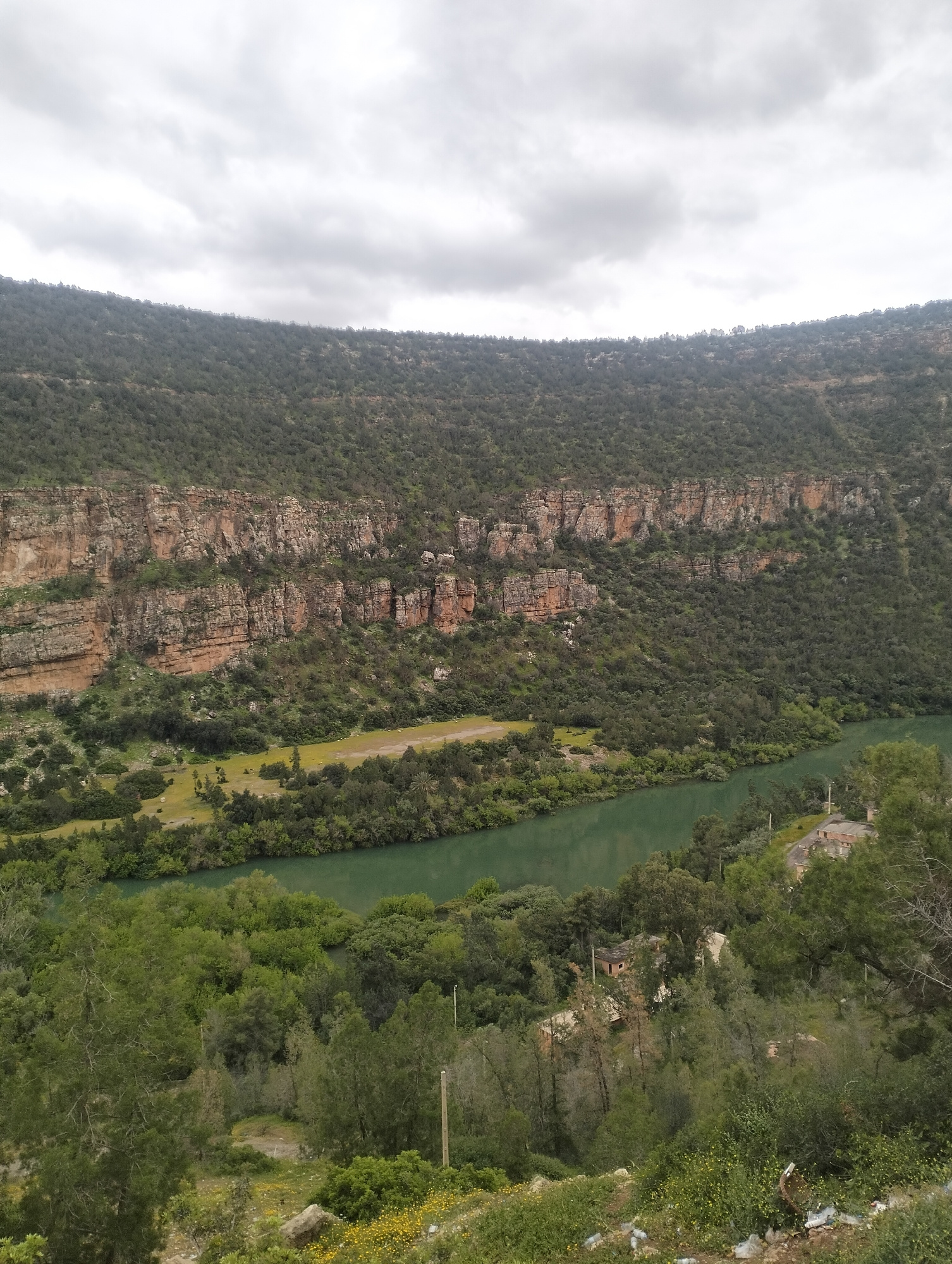 The image shows a landscape in or near the city of Bin El Ouidane, Morocco. A wide, green river flows through a valley between hills. The hillside on the far side of the river has a prominent cliff fa…read more