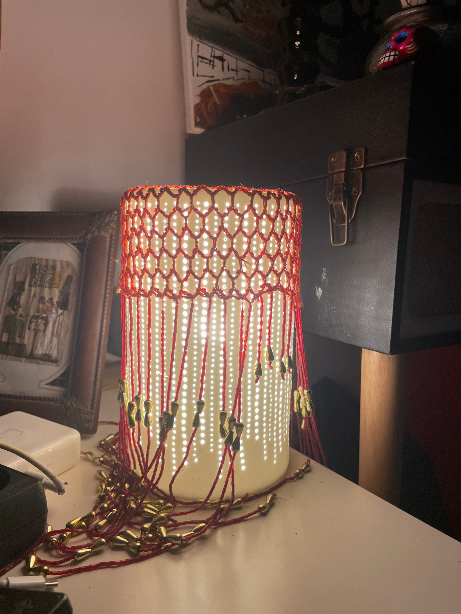 The image shows a cylindrical lamp with a white perforated body covered in a red macrame-style net and draped with strands of red beads terminating in gold-colored metal tips. The lamp is located on a…read more