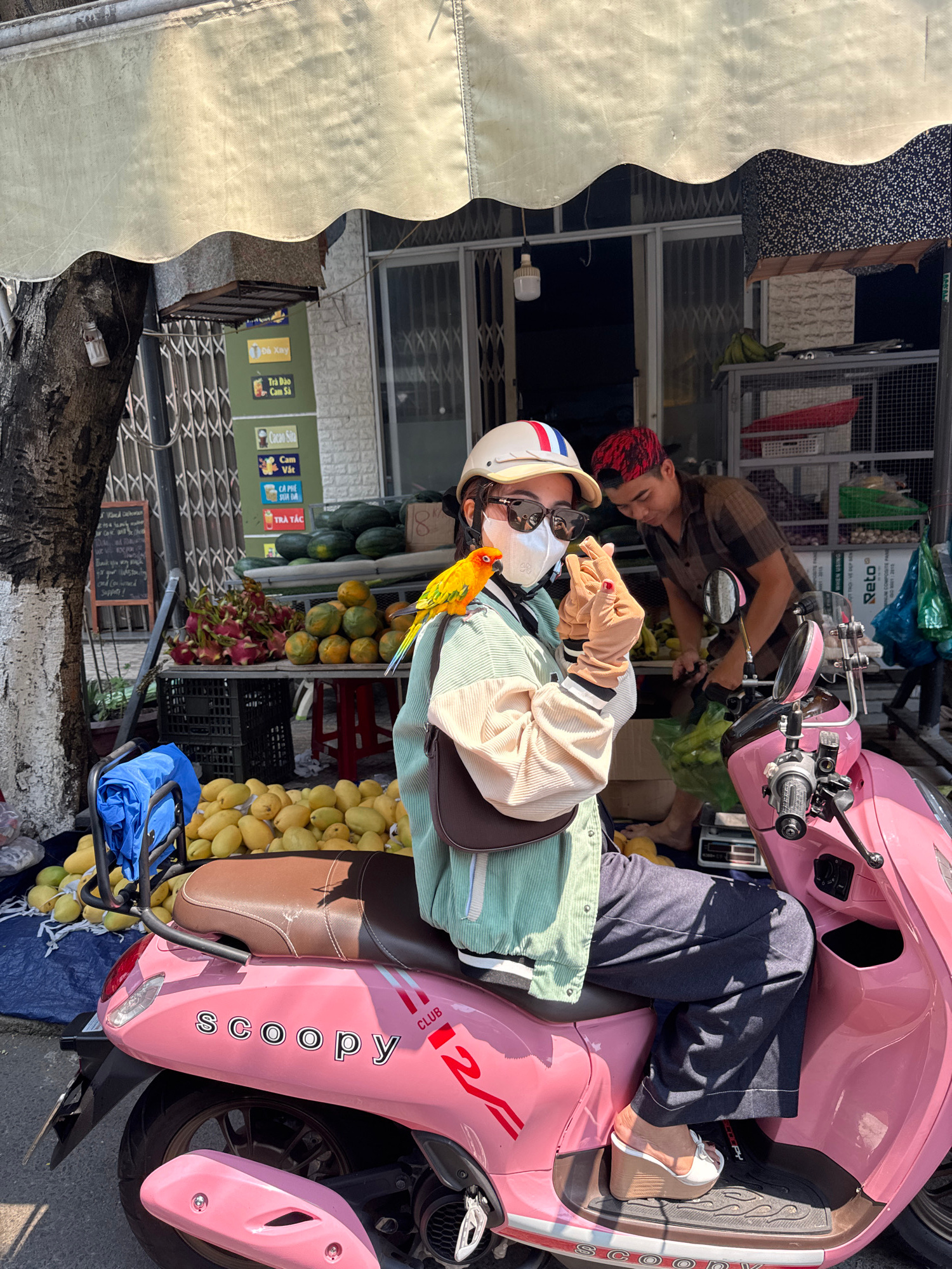 The image depicts a person seated on a pink "Scoopy" moped in what appears to be a street setting in Đà Nẵng, Vietnam. The person is wearing a helmet, sunglasses, a face mask, and a light-colored jack…read more