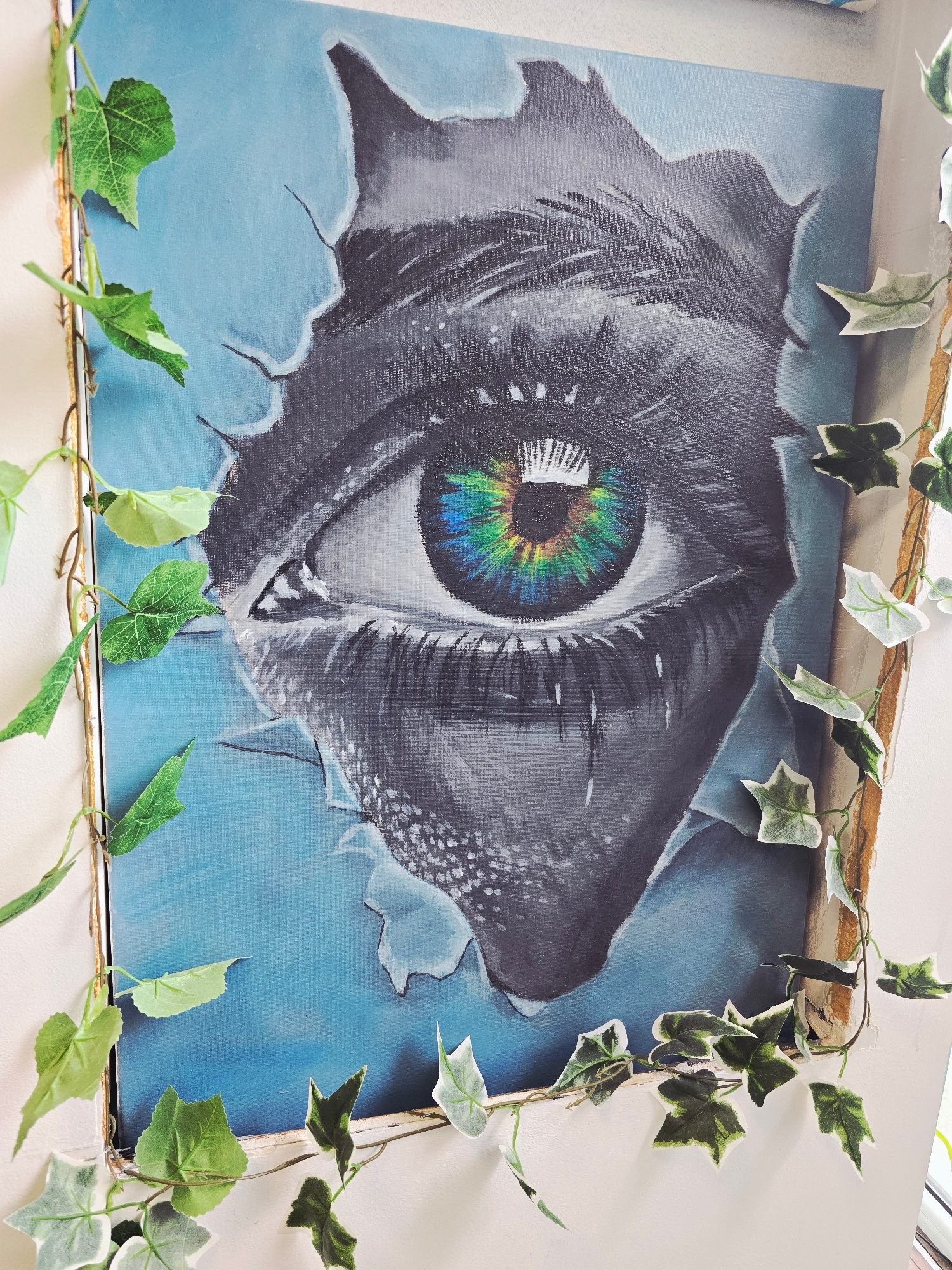 The image shows a painting of an eye tearing through a blue background. The eye is predominantly gray with a vibrant, multicolored iris (green, yellow, and blue). The painting is framed and decorated…read more