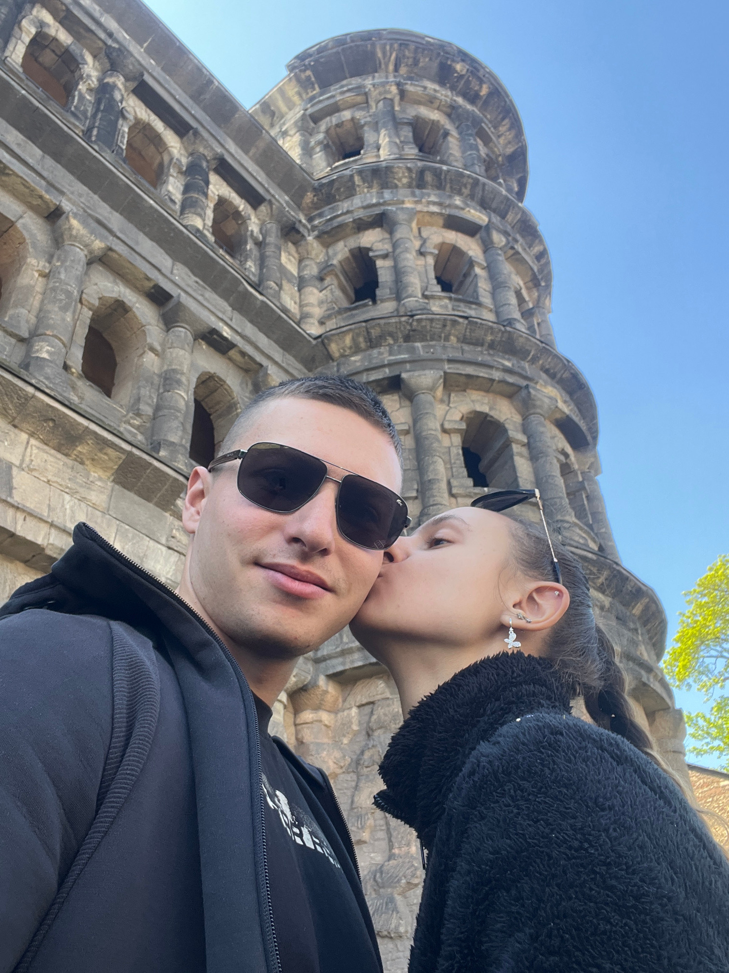 A man and a woman are posing for a photograph in front of the Porta Nigra in Trier, Germany. The man is wearing sunglasses and a black jacket and the woman is kissing him on the cheek. The Porta Nigra…read more