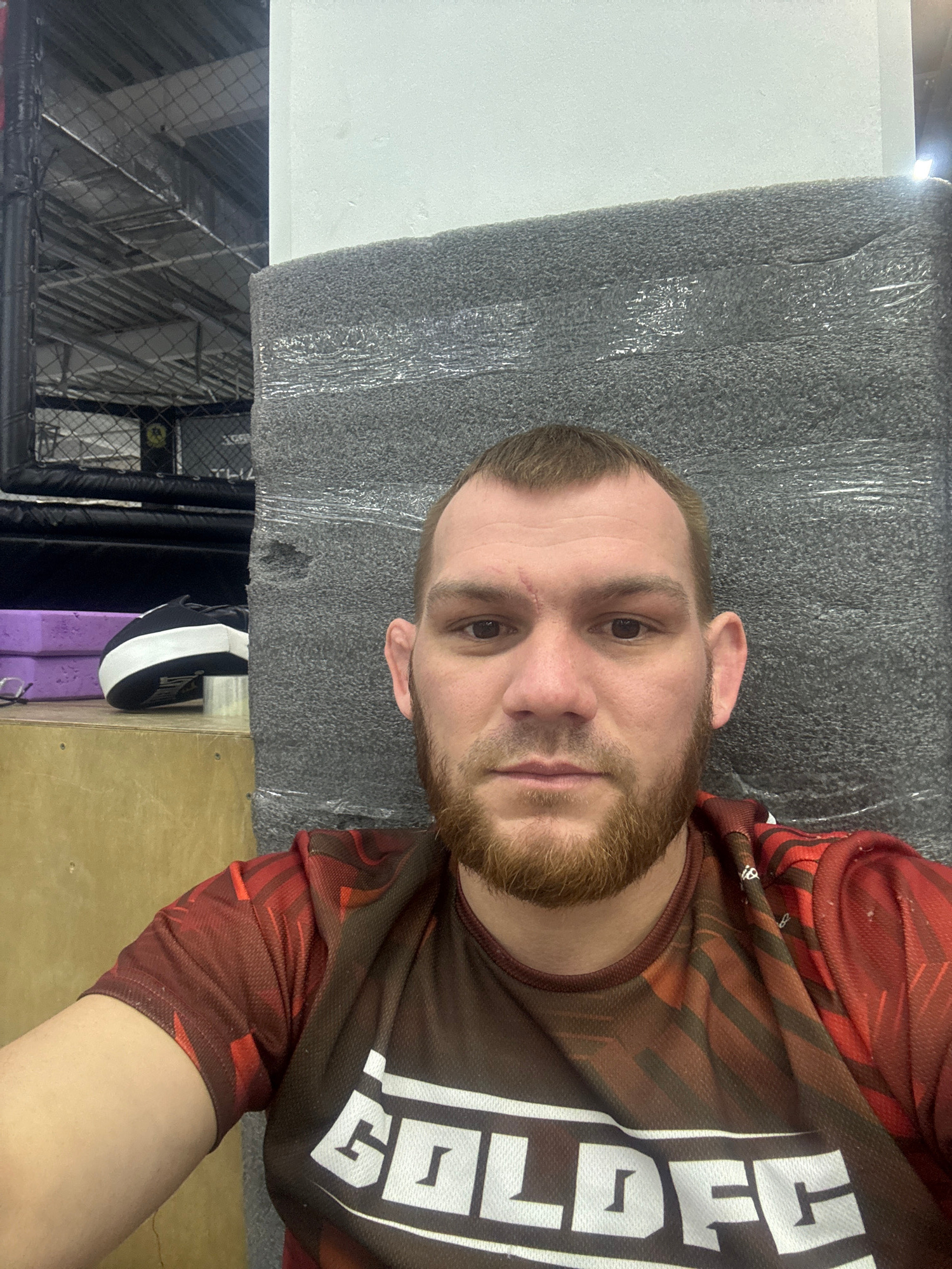 This media file shows a close-up image of a man, rotated 90 degrees clockwise. The setting appears to be a combat sports gym or training facility in Perm, Russia. The central subject is a man with a…read more