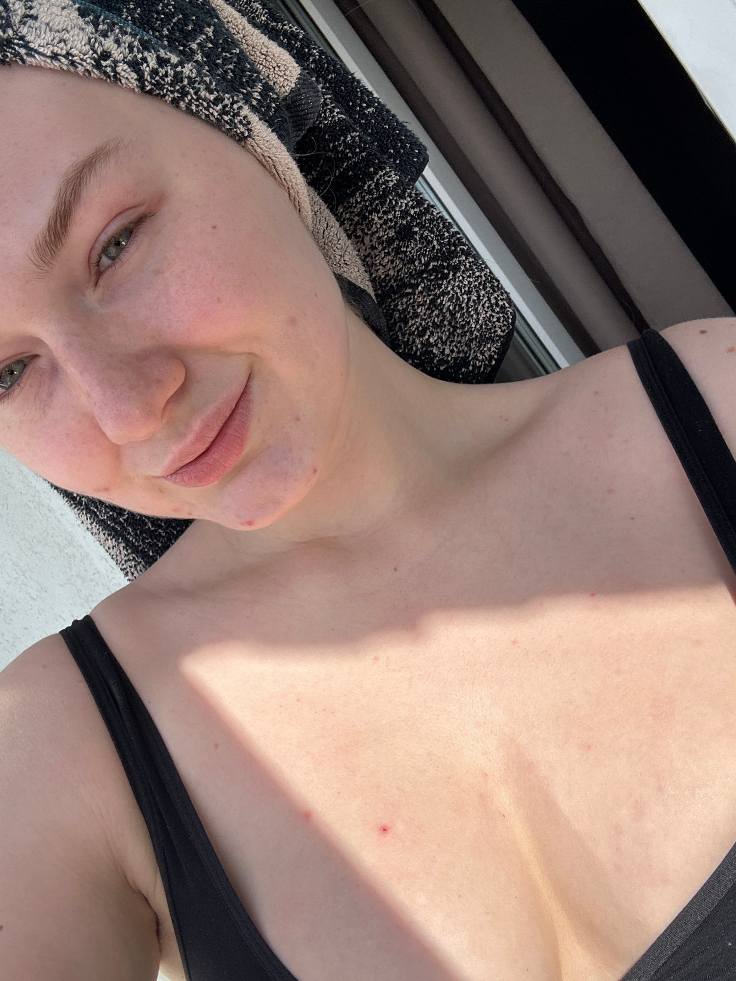 The image displays a female individual, captured from approximately the upper chest upwards, illuminated by bright natural light. Her head is wrapped in a black and beige/white patterned towel, securi…read more