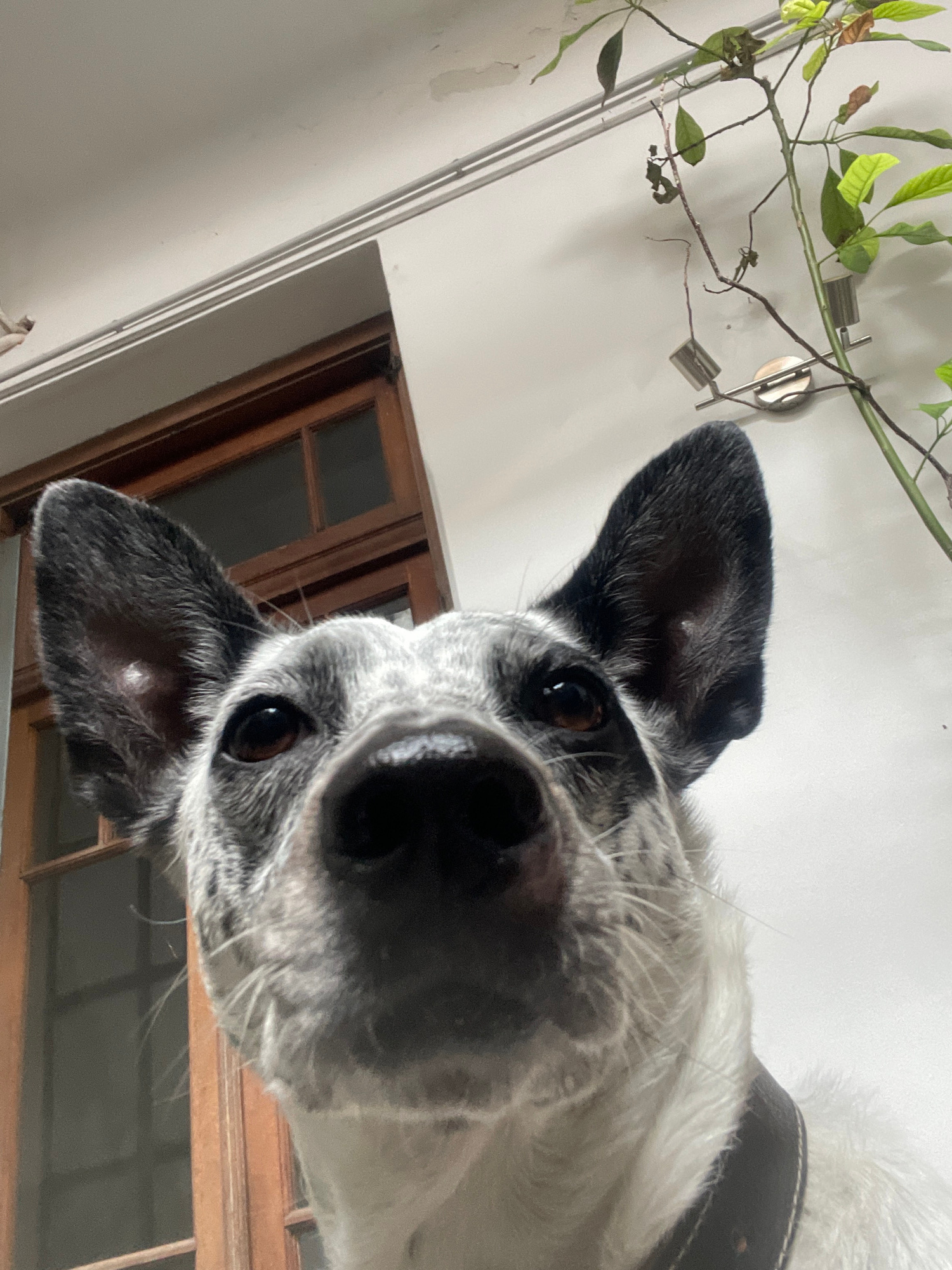 A close-up, tilted, low-angle shot of a white and black dog with dark brown eyes looking directly at the camera. The dog's nose is prominently featured in the foreground. The background includes a whi…read more