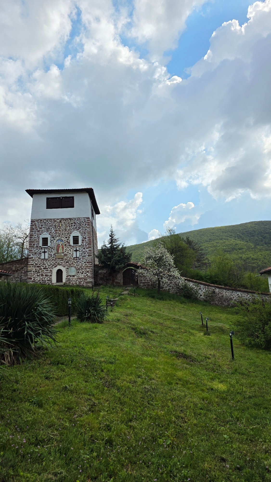 The image captures a stone building in Belimel, Bulgaria. The building has a white façade with a tiled roof and windows. It is situated on a grassy hillside, near a stone wall and some trees. The sky…read more