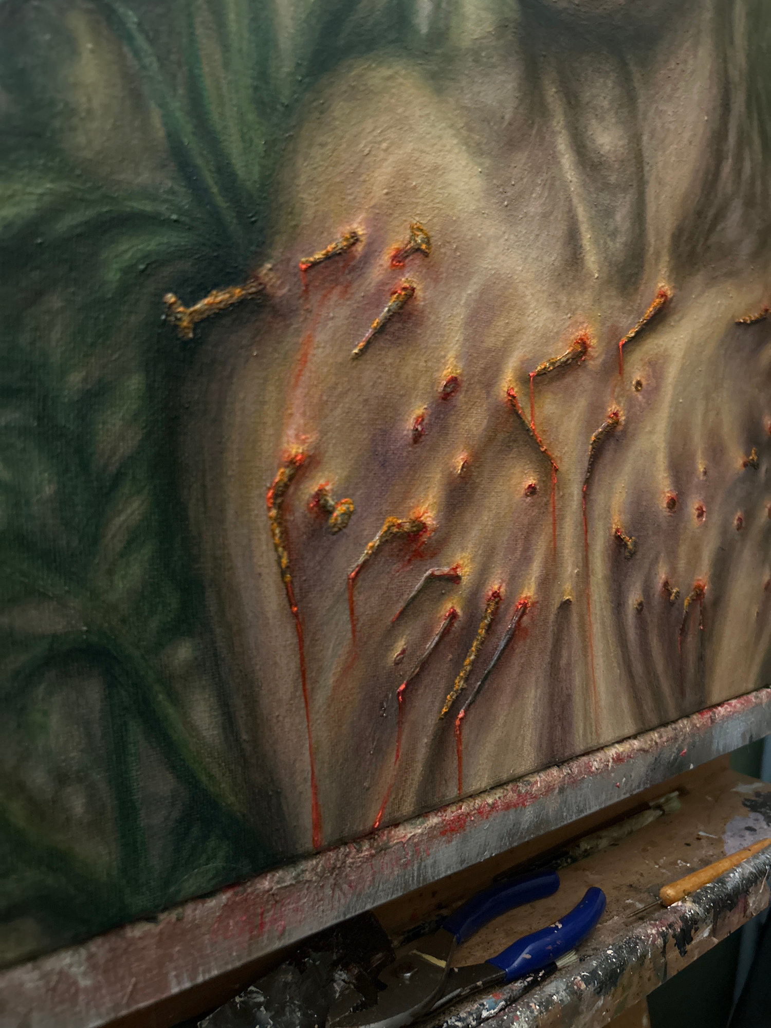 The image shows a close-up of a section of artwork in progress, likely an oil painting on canvas. The dominant colors are muted earth tones of brown, beige, and green, creating a somber mood. The canv…read more