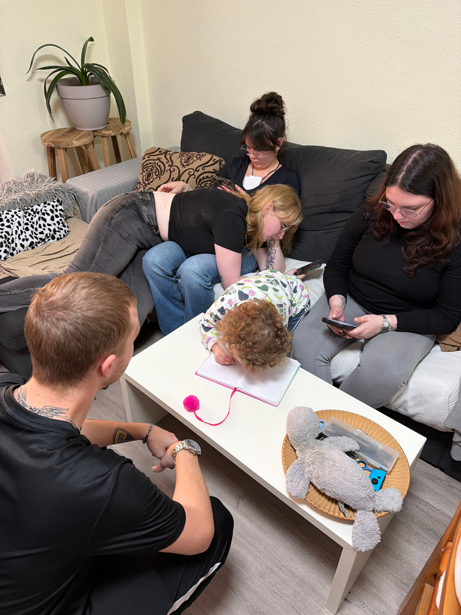 The image presents a domestic scene, showing a group of people gathered together in an interior setting. Three adults are seated on a couch along the left side of the frame. One woman is wearing a bl…read more