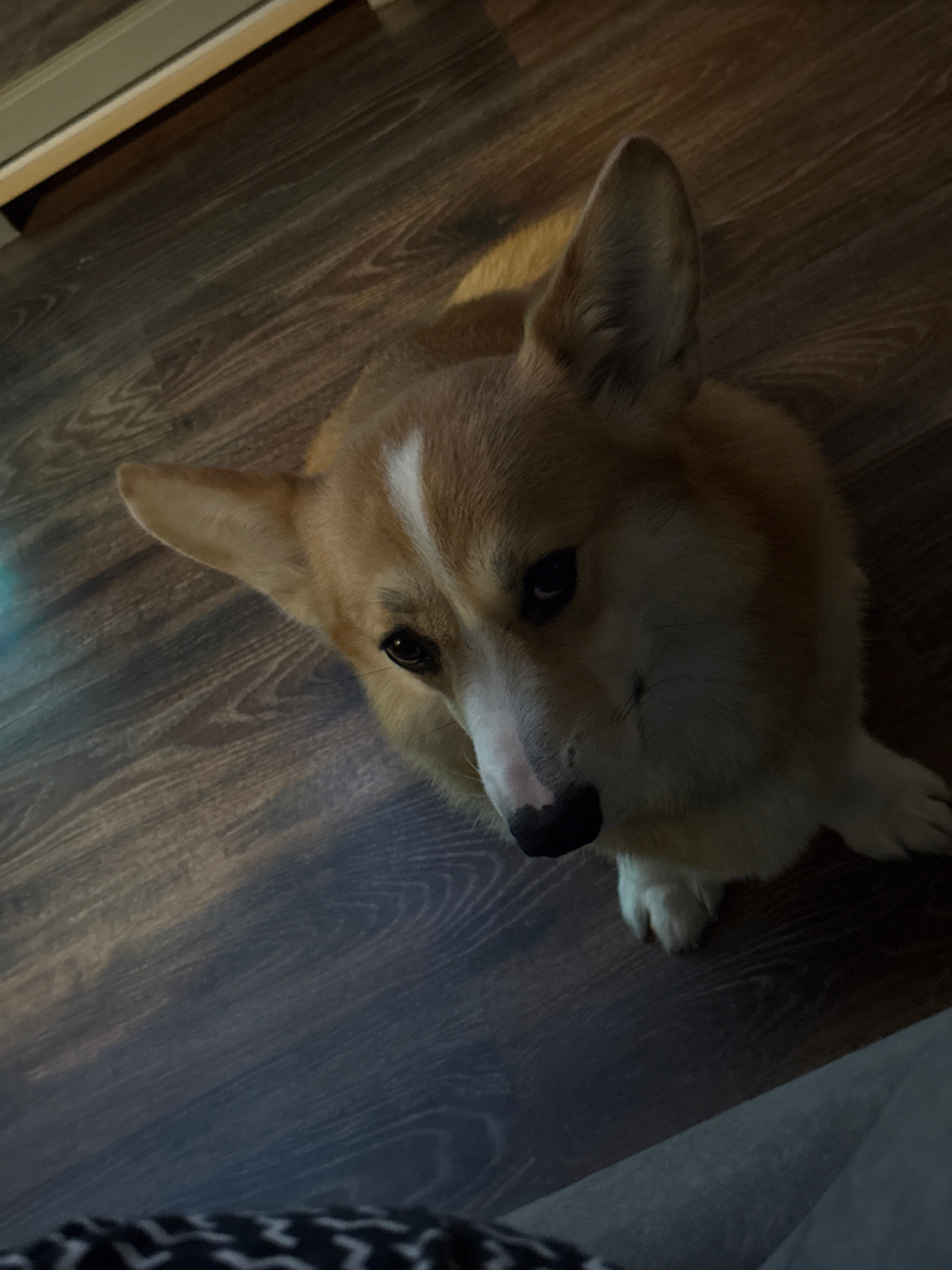 A corgi dog is sitting on a wood-look floor, looking up towards the camera. The dog is light brown and white, with a black nose. The floor appears to be inside. There is no evidence suggesting this im…read more