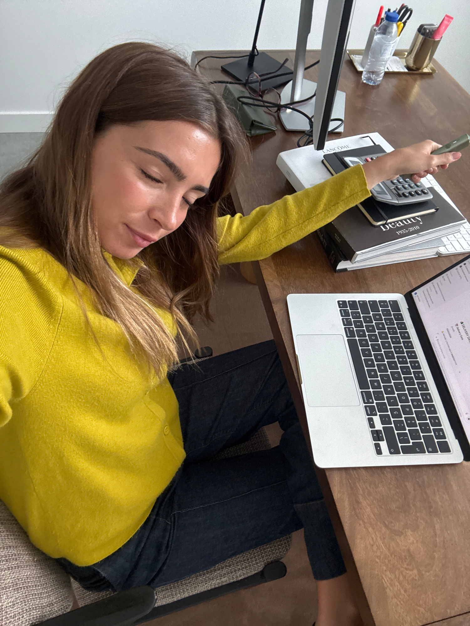 A woman in a yellow sweater is lying down at a desk. She is holding a small, grey object in her hand. On the desk is a laptop, a stack of books, a calculator, and a water bottle. The woman is wearing…read more