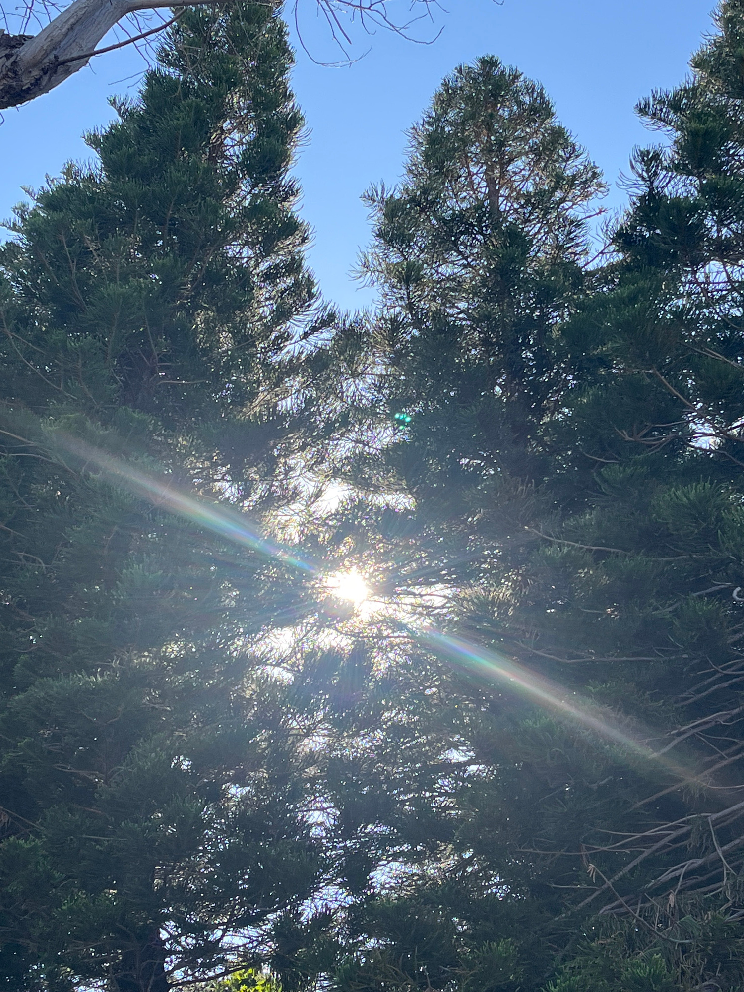 The image is an upward shot of a tree canopy against a light blue sky. The sun is visible through the foliage, creating a bright glare and lens flare. The trees appear to be evergreen, with dense, dar…read more