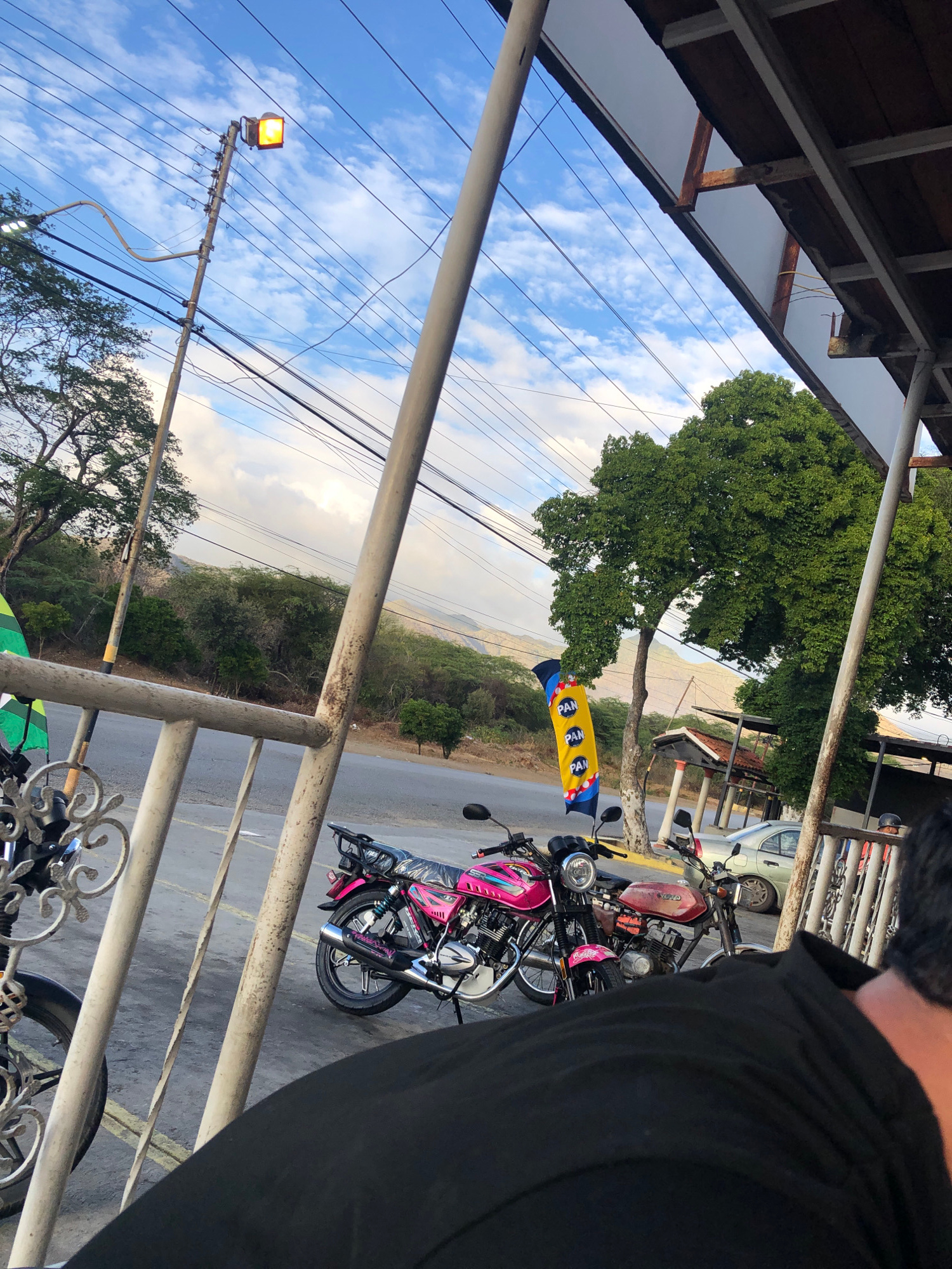 The photograph depicts an outdoor scene in La Tagua, Venezuela, viewed from under the partial shelter of a structure with a corrugated roof and metal support beams. A blue and yellow flag is fixed to…read more