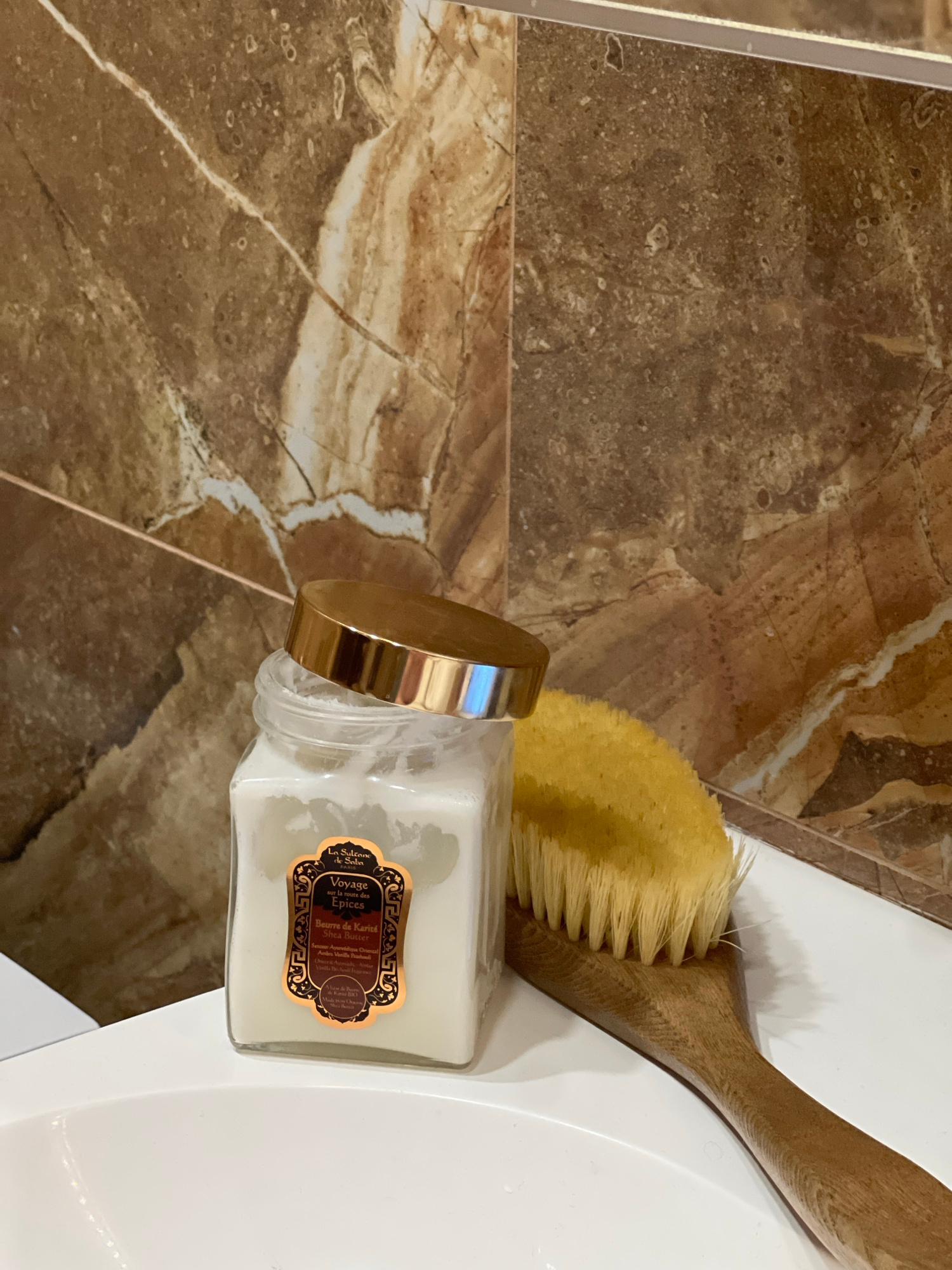 Here is a description of the image: The image shows a bathroom scene. A partially visible white sink is positioned to the right, next to brown and tan marble-like tiles. On the sink's edge, there are…read more