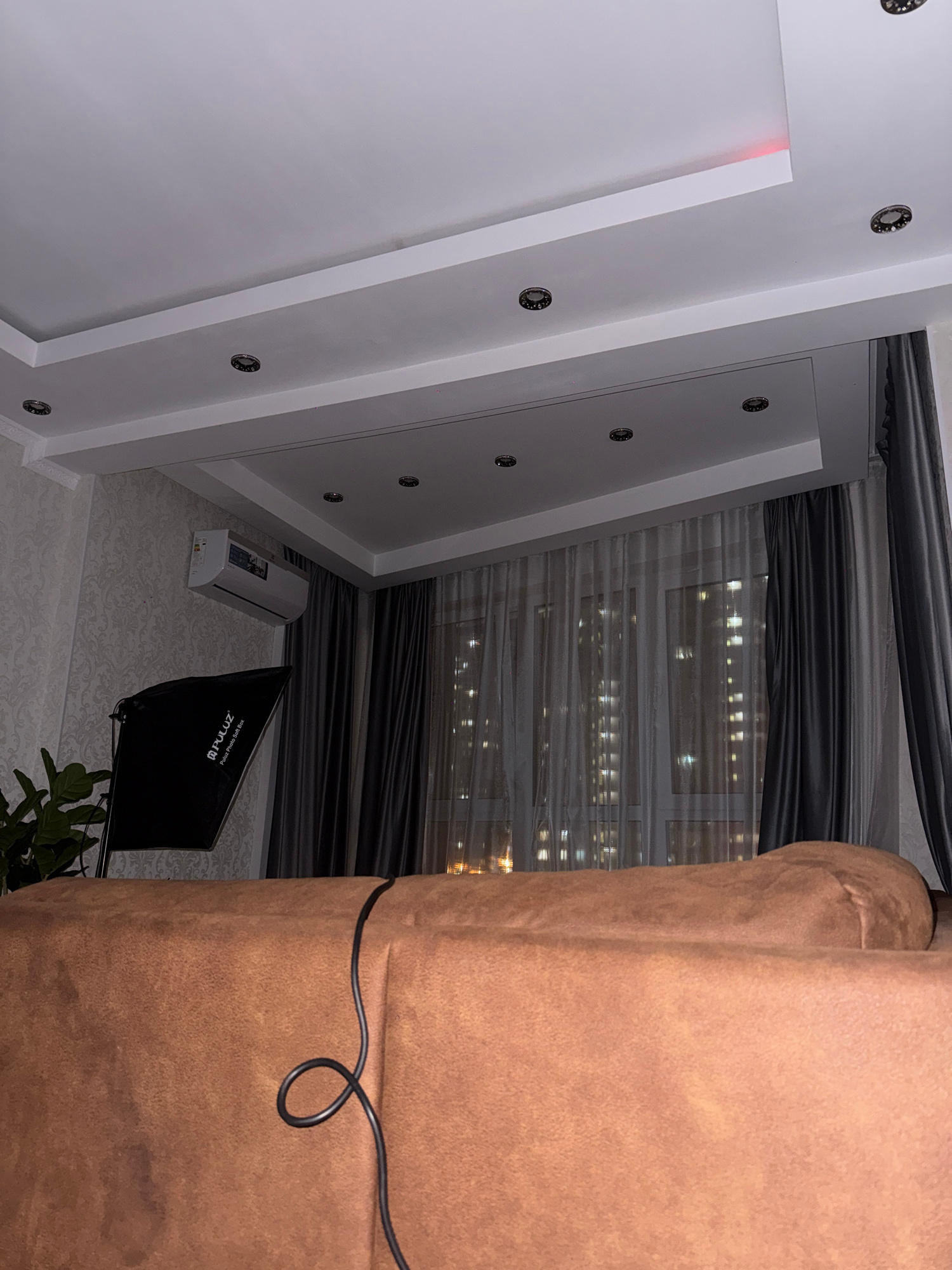 The image shows an interior view, featuring a partial view of a brown couch on the right, with a visible power cord attached. In the background, a window with dark blinds reveals a cityscape at night,…read more