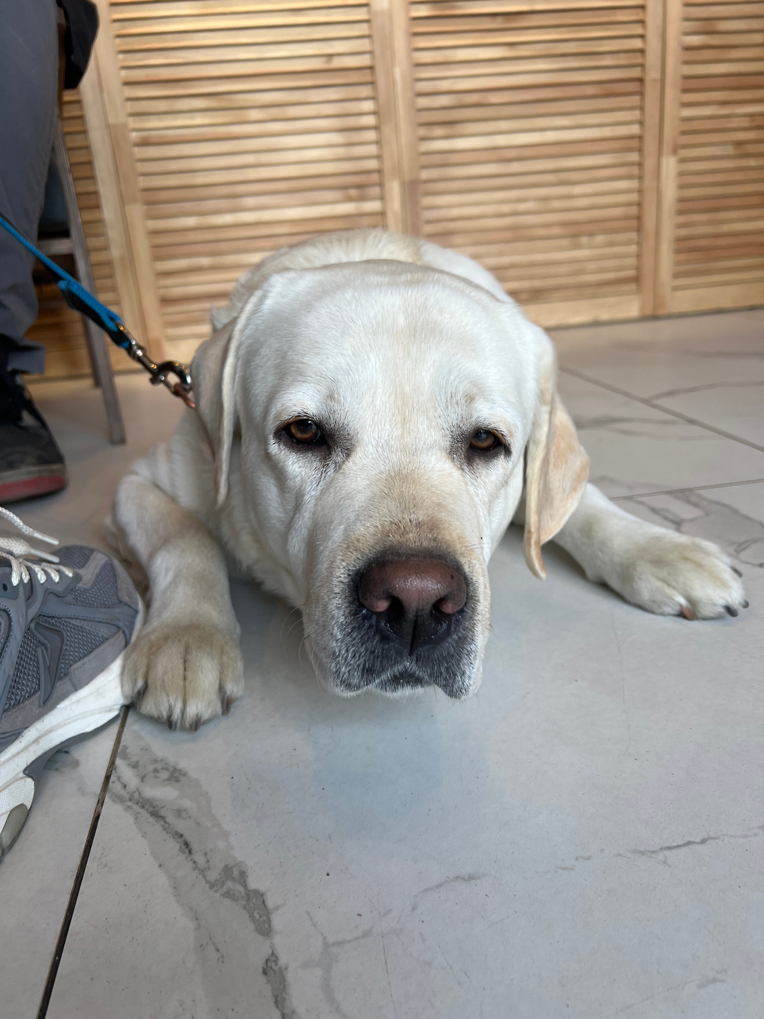 A light-colored Labrador Retriever dog is prominently featured, lying on a light grey tiled floor. The dog's head is tilted upwards, looking directly at the viewer with warm brown eyes and a dark nose…read more
