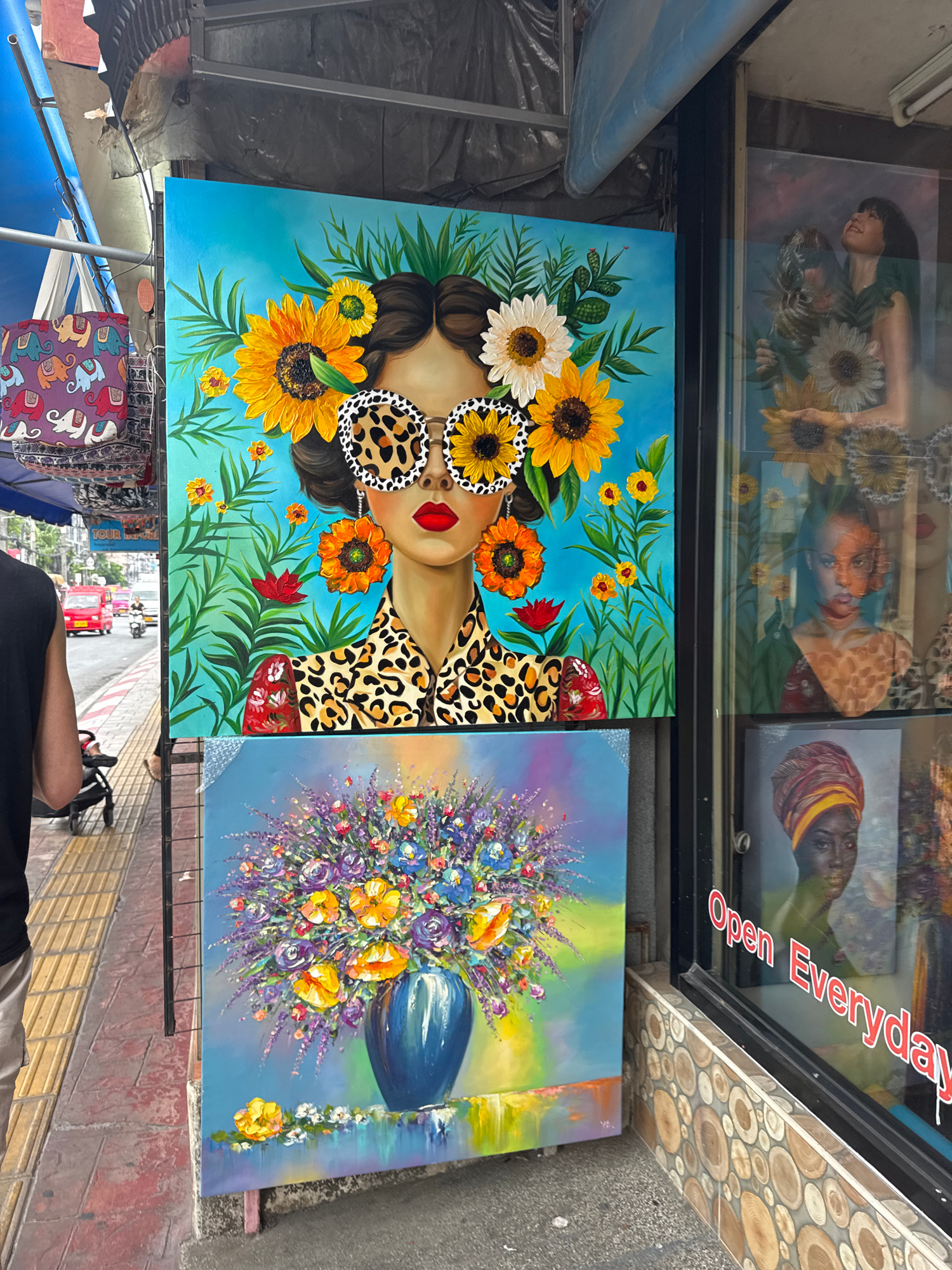 The image shows a street art stall in Patong, Thailand. The stall has two large paintings displayed on the ground: one of a woman with leopard print clothing and sunflower-shaped sunglasses, and anoth…read more