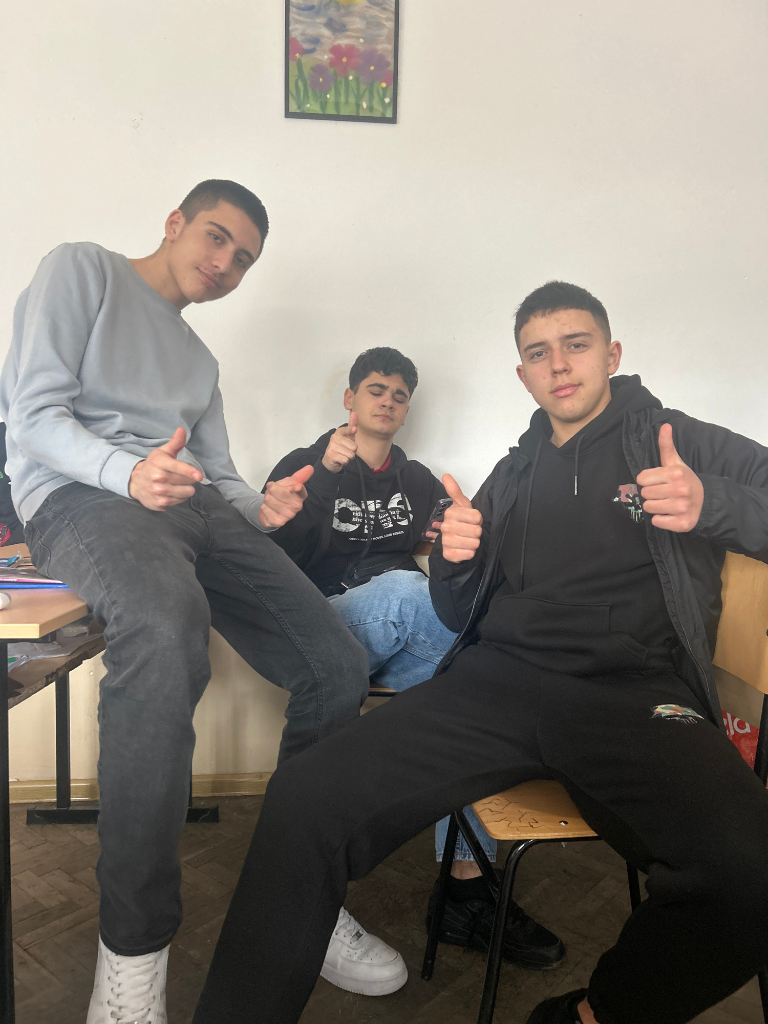 Three young men are sitting in a classroom, each giving a thumbs-up gesture. The man in the foreground is wearing a light grey sweatshirt and dark grey jeans, and the man at the top is wearing a black…read more