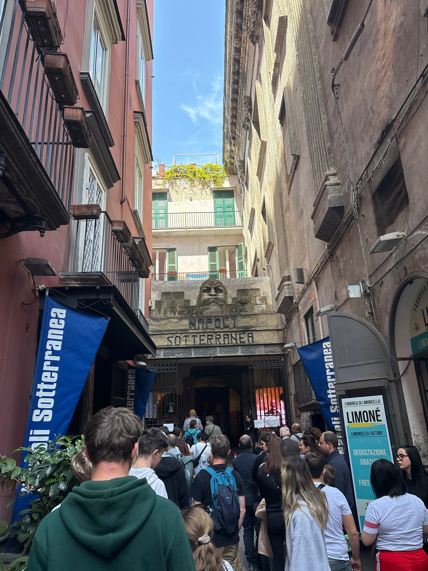 The image captures a street scene in Naples, Italy, featuring a crowd of people gathered at the entrance of "Napoli Sotterranea" (Naples Underground), a historical underground site. The entrance is ma…read more