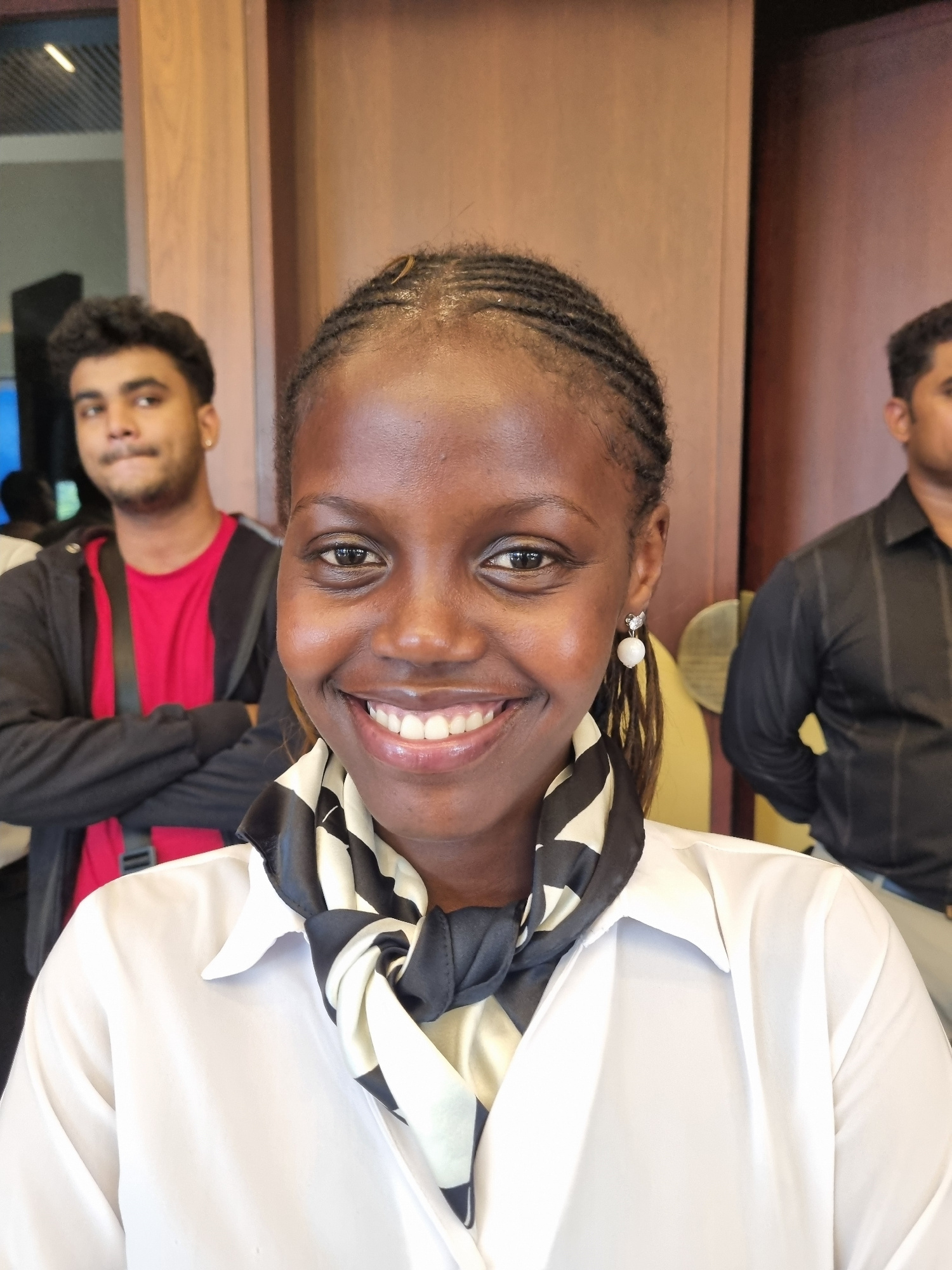 A medium-shot, rotated image shows a woman smiling broadly at the camera. She has dark skin, dark eyes, and braided hair with a light shimmer. She is wearing a white blouse and a black-and-white scarf…read more