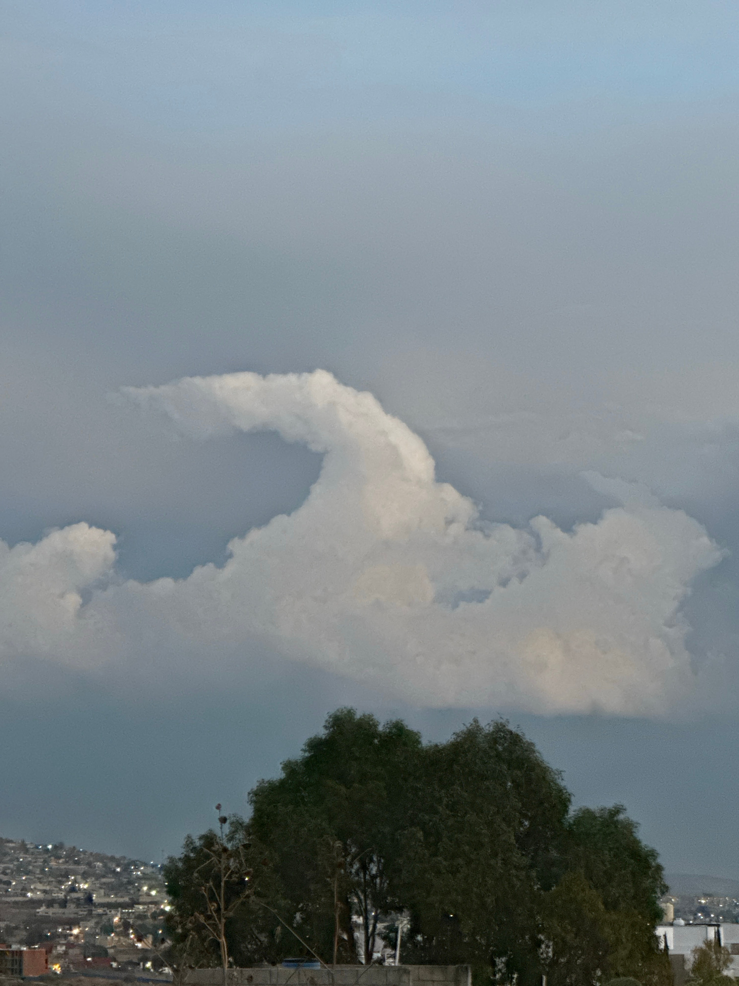 The image captures a cloudy sky above what appears to be a hillside community, presumably within the city of Puebla, Mexico, given the prompt’s direction. In the foreground, a dense, dark green tree i…read more